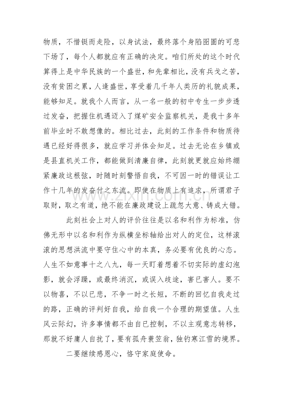 苏轼名篇《赤壁赋》中有句名言:寄蜉蝣于天地,渺沧海之一粟。哀吾生之须臾,羡长江之无穷。在上学的时候的时候一篇英语课文对人的描述也让我印象深入:人但是是茫茫宇宙间漫漫星河里一个角落的小星球上性命长河的一个小片断而已,可见人生苦短,人其实真的微小得可怜,那苦苦追求的物质东西更是不值一提了。在人的生命中,到底是踏踏实实平平安安,活出人生的价值,还是为了一丁点的物质,不惜铤而走险,以身试法,最终落个身陷囹圄的可悲下场了,每个人都就应有正确的决定。咱们所处的这个时代算得上是中华民族的一个盛世,和先辈相比,没有兵戈之苦,没有贫困之累,人逢盛世,享受着几千年人类历的礼貌成果,能够知足。就我个人而言,从一名一般的初中专生一步步透过发奋,把握住机遇迈入了煤矿安全监察机关,是我十多年前毕业时不敢想像的。相比过去,此刻的工作条件和物质待遇已经好得很多,就应学习并体会知足。过去无论在乡镇或是县直机关工作,都能做到清廉自律,此刻就更就应始终绷紧廉政这根弦,时随时刻警悟自我,不可因一时的错误让工作十几年的发奋付之东流。即使在物质上有追求,所谓君子取财,取之有道,绝不能在廉政建设上疏忽大意、铸成大错。
