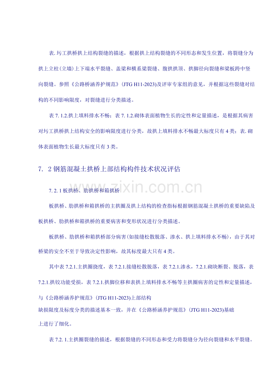 其中表7.2.3.跨中下挠,表7.2.3.横系梁与拱片联结松动、开裂,表7.2.3.微弯板穿孔、塌陷、露筋和表7.2.3.拱脚位移等刚架拱片或微弯板的定性和定量描述,是以《公路桥涵养护规范》(JTG H11-2023)的描述为基础进行细化。挠度等指标是根据《公路桥梁承载能力检测评估规程》(报批稿)和《公路钢筋混凝土及预应力混凝土桥涵设计规范》(JTG H11-2023)相关指标的规定而拟定。