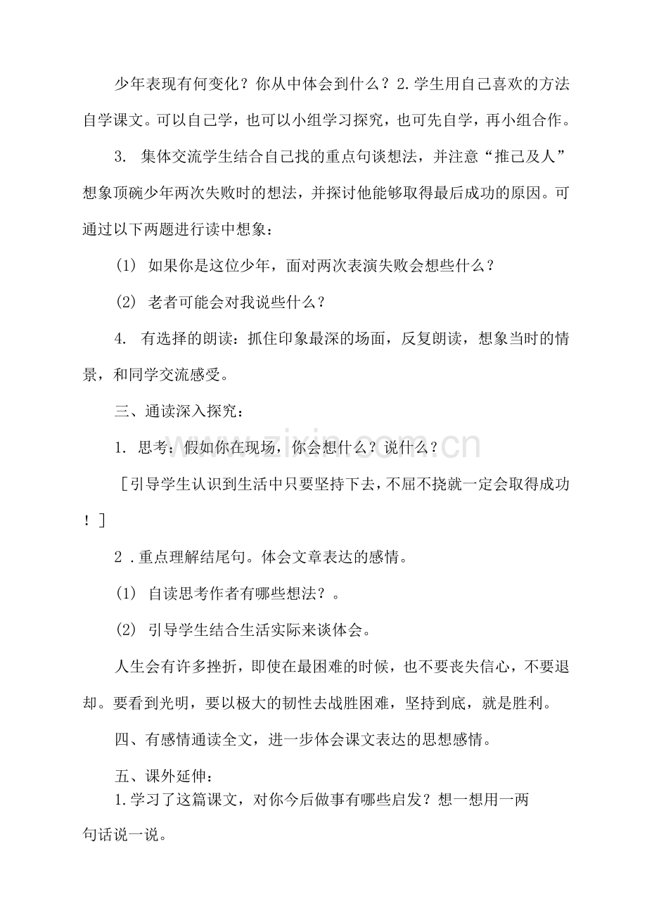 3. 集体交流学生结合自己找的重点句谈想法,并注意“推己及人”想象顶碗少年两次失败时的想法,并探讨他能够取得最后成功的原因。可通过以下两题进行读中想象:
