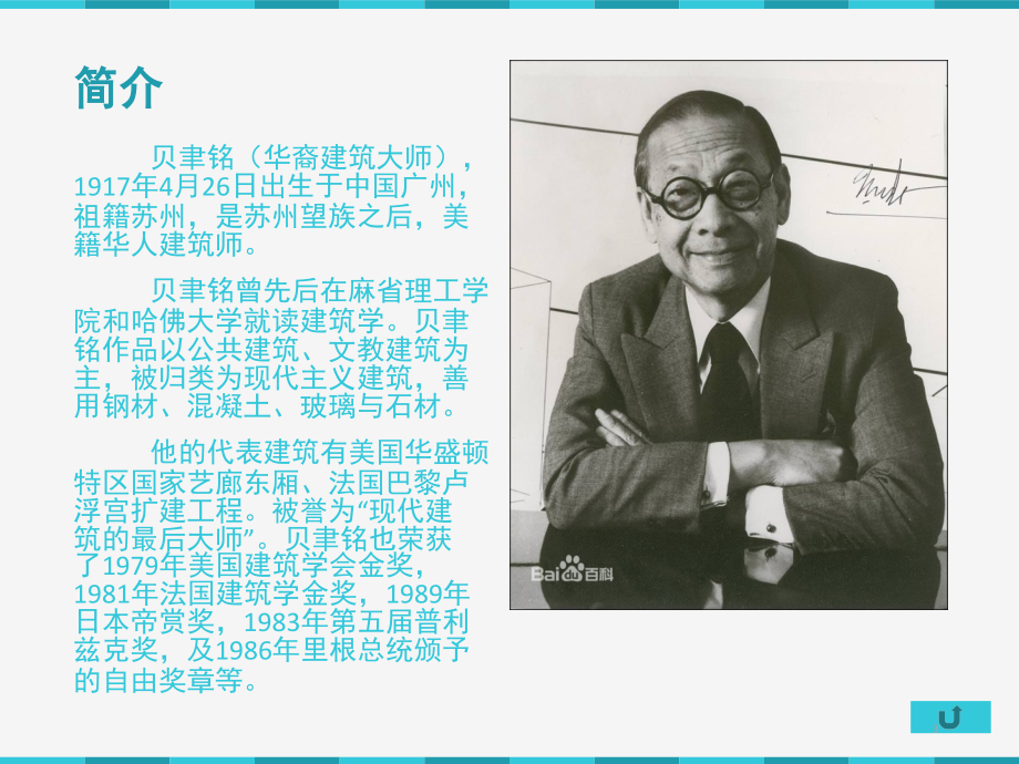 单击此处编辑母版标题样式,单击此处编辑母版文本样式,第二级,第三级,第四级,第五级,*,单击此处编辑母版文本样式,第二级,*,单击此处编辑母版标题样式,单击此处编辑母版文本样式,第二级,单击此处编辑母版标题样式,*,贝 聿 铭,点击进入,1,目录,简介,人物经历,建筑作品,获奖记录,艺术特点,社会评价,作品欣赏,结束,2,简介,贝聿铭(华裔建筑大师),1917年4月26日出生于中国广州,祖籍苏州,是苏州望族之后,美籍华人建筑师。,贝聿铭曾先后在麻省理工学院和哈佛大学就读建筑学。贝聿铭作品以公共建筑、文教建筑为主,被归类为现代主义建筑,善用钢材、混凝土、玻璃与石材。,他的代表建筑有美国华盛顿特区国家艺廊东厢、法国巴黎卢浮宫扩建工程。被誉为“现代建筑的最后大师”。贝聿铭也荣获了1979年美国建筑学会金奖,1981年法国建筑学金奖,1989年日本帝赏奖,1983年第五届普利兹克奖,及1986年里根总统颁予的自由奖章等。,3,人物经历,早年经历,事业经历,晚年经历,4,早年经历,1917年4月26日贝聿铭生于广州,他为苏州望族之后,在狮子林里度过了童年的一段时光;,1927年贝聿铭回到上海就读青年会中学1,高中就读于上海圣约翰大学附属中学;,1935年贝聿铭远赴美国留学,先后在麻省理工学院和哈佛大学学习建筑;,1939年贝聿铭以优异的成绩毕业,获得了美国建筑师协会的奖项;,第二次世界大战爆发后,他在美国空军服役三年。,1944年贝聿铭退役,进入哈佛大学攻读硕士学位;,1945年,贝聿铭留校受聘为设计研究所助理教授。,1948年贝聿铭从纯学术的象牙之塔进入实际的建筑领域,纽约市极有眼光和魄力的房地产开发富商威廉柴根道夫打破美国建筑界的惯例,首次聘用中国人贝聿铭为建筑师,担任他创办的韦伯纳普建筑公司的建筑研究部主任。他们合作达十二年之久。十二年中,贝聿铭为柴根道夫的房地产公司完成了许多商业及住宅群的设计,也做不少社会改建计划。贝聿铭还为母校麻省理工学院设计了科学大楼,为纽约大学设计了两栋教职员工住宅大厦。这一切,使贝聿铭在美国建筑界初露头角,也奠定了他此后数十年的事业基础。,5,事业经历,1960年聿铭离开柴根道夫,自立门户,成立了自己的建筑公司。,他在纽约、费城、克利夫兰和芝加哥等地设计了许多既有建筑美感又经济实用的大众化的公寓。他在费城设计的三层社会公寓就很受工薪阶层的欢迎。因此,费城莱斯大学在一九六三年颁赠他“人民建筑师”的光荣称号。同年,美国建筑学会向他颁发了纽约荣誉奖。华盛顿邮报称他的建筑设计是真正为人民服务的都市计划。,在贝聿铭早期的作品有密斯的影子,不过他不像密斯以玻璃为主要建材,贝聿铭采用混凝土,如纽约富兰克林国家银行,镇心广场住宅区,夏威夷东西文化中心。到了中期,历练累积了多年的经验,贝聿铭充分掌握了混凝土的性质,作品趋向于柯比意式的雕塑感,其中当以全国大气研究中心,达拉斯市政厅,等皆属此方面的经典之作。,6,贝聿铭摆脱密斯风格当属甘乃迪纪念图书馆为滥觞,几何性的平面取代规规矩矩的方盒子,蜕变出雕塑性的造型。贝聿铭身为齐氏威奈公司专属建筑师,从事大尺度的都市建设案,贝聿铭从这些开发案获得对土地使用的宝贵经验,使得他的建筑设计不单考虑建筑物本身,更关切环境提陹到都市设计的层面,着重创造社区意识与社区空间,其中最脍炙人口的当属费城社会岭住宅社区一案,而他们所接受的案子以办公大楼与集合住宅为主,贝聿铭后来取得齐氏集团的协议于1955年将建筑部门改组为贝聿铭建筑师事务所开始独立执业,事务所共从事过114件设计案,其中66件是贝聿铭负责。,1964年,为纪念已故美国总统约翰肯尼迪,政府决定在波士顿港口建造约翰肯尼迪图书馆。这座建造时间长达十五年,于1979年才落成的图书馆,由于设计新颖、造型大胆、在美国建筑界引起轰动,被公认是美国建筑史上最佳杰作之一。,7,美国建筑界宣布1979年为“贝聿铭年”,授予他该年度的美国建筑学院金质奖章。而于此前一年落成的华盛顿国家艺术馆东馆的设计,已经奠定了贝聿铭作为世界级建筑大师的地位。,1979年,改革开放刚刚起步的中国政府邀请贝聿铭设计香山饭店。贝聿铭根据自己的一贯想法“越是民族的,越是世界的”,不辞劳苦地走访了北京、南京、扬州、苏州、承德等地,寻找灵感,搜集素材,最后采取了建筑一系列不规则院落的布局方式,使香山饭店与周围的水光山色,参天古树融为一体,成为具有浓郁中国风格的建筑。香山饭店的规模不算大,但“体现出中国民族建筑艺术的精华”。,8,晚年经历,晚年的贝聿铭仍然接收了多个项目,例如卢浮宫玻璃金字塔、中银大厦、苏州博物馆和伊斯兰艺术博物馆。,1980年,法国总统密特朗邀请贝聿铭翻修卢浮宫,贝聿铭认为设计的东馆只跟其相差40年,但卢浮宫有着800年的历史,卢浮宫玻璃金字塔的设计对于贝聿铭来说是一个很大的挑战。,1983年,卢浮宫有7个部分,每个部分都是独立的。因为相互竞争着空间和资金,每个部门的馆长甚至不相往来。因此在重修时,贝聿铭建筑团队努力让7个部分统一成一个建筑物。,贝聿铭不知道密特朗总统有无意识到这个挑战的严峻性。但贝聿铭团队最终让它们在建筑上统一成了整体。,从1990年开始,贝聿铭不那么在乎建筑物的造型了。设计一个独特的建筑造型对贝聿铭
