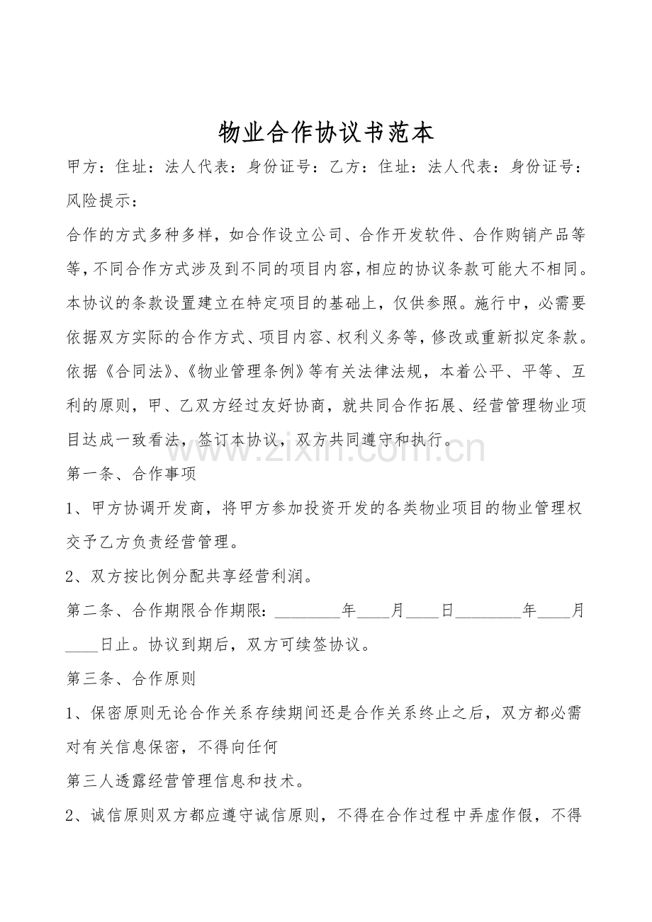 本协议的条款设置建立在特定项目的基础上,仅供参照。施行中,必需要依据双方实际的合作方式、项目内容、权利义务等,修改或重新拟定条款。 依据《合同法》、《物业管理条例》等有关法律法规,本着公平、平等、互利的原则,甲、乙双方经过友好协商,就共同合作拓展、经营管理物业项目达成一致看法,签订本协议,双方共同遵守和执行。