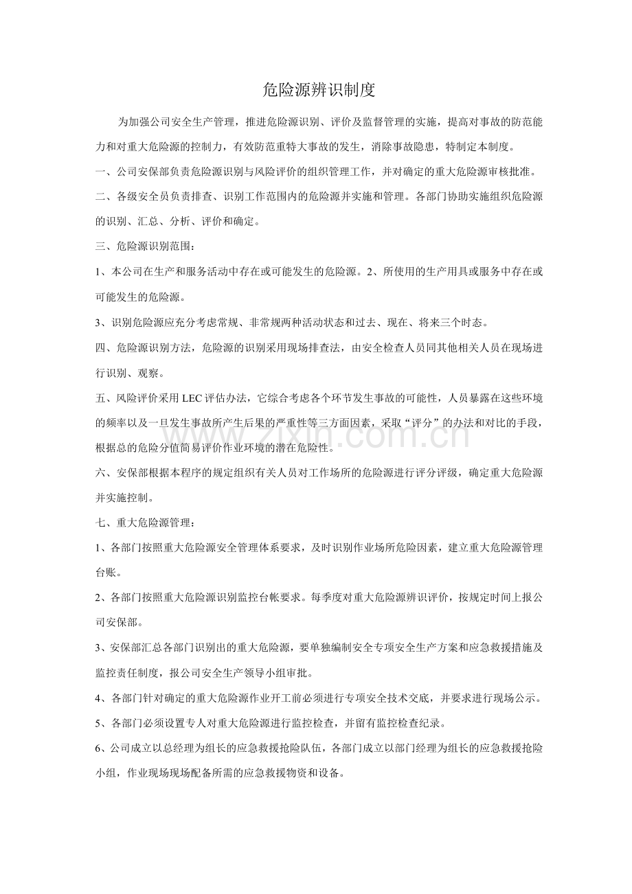 为加强公司安全生产管理,推进危险源识别、评价及监督管理的实施,提高对事故的防范能力和对重大危险源的控制力,有效防范重特大事故的发生,消除事故隐患,特制定本制度。