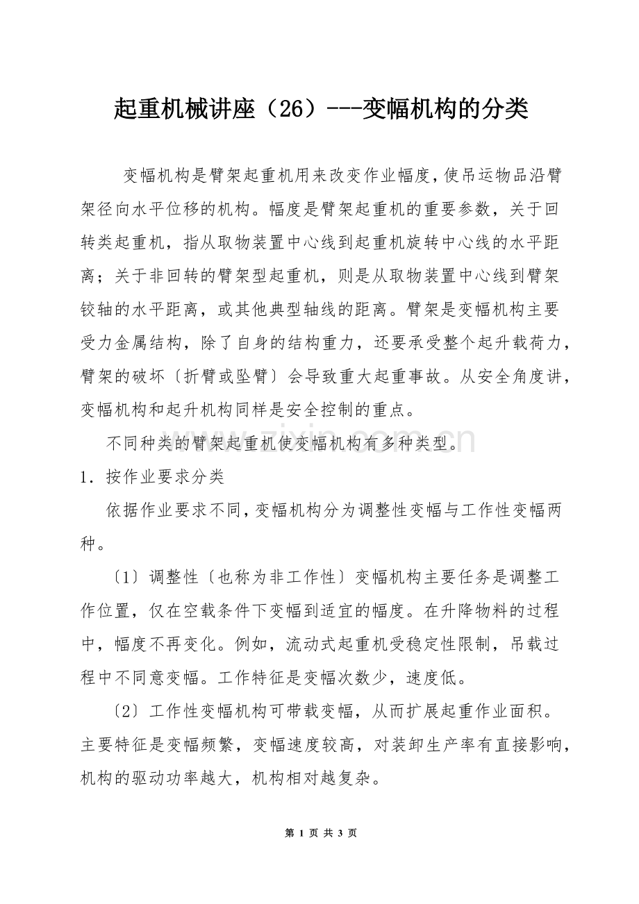 变幅机构是臂架起重机用来改变作业幅度,使吊运物品沿臂架径向水平位移的机构。幅度是臂架起重机的重要参数,关于回转类起重机,指从取物装置中心线到起重机旋转中心线的水平距离;关于非回转的臂架型起重机,则是从取物装置中心线到臂架铰轴的水平距离,或其他典型轴线的距离。臂架是变幅机构主要受力金属结构,除了自身的结构重力,还要承受整个起升载荷力,臂架的破坏〔折臂或坠臂〕会导致重大起重事故。从安全角度讲,变幅机构和起升机构同样是安全控制的重点。