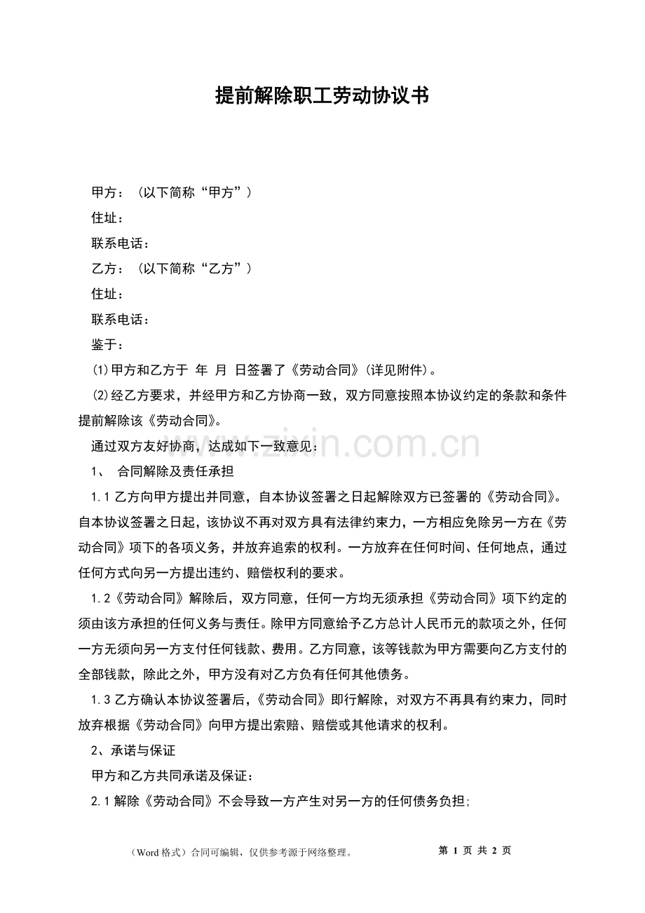 (2)经乙方要求,并经甲方和乙方协商一致,双方同意按照本协议约定的条款和条件提前解除该《劳动合同》。
