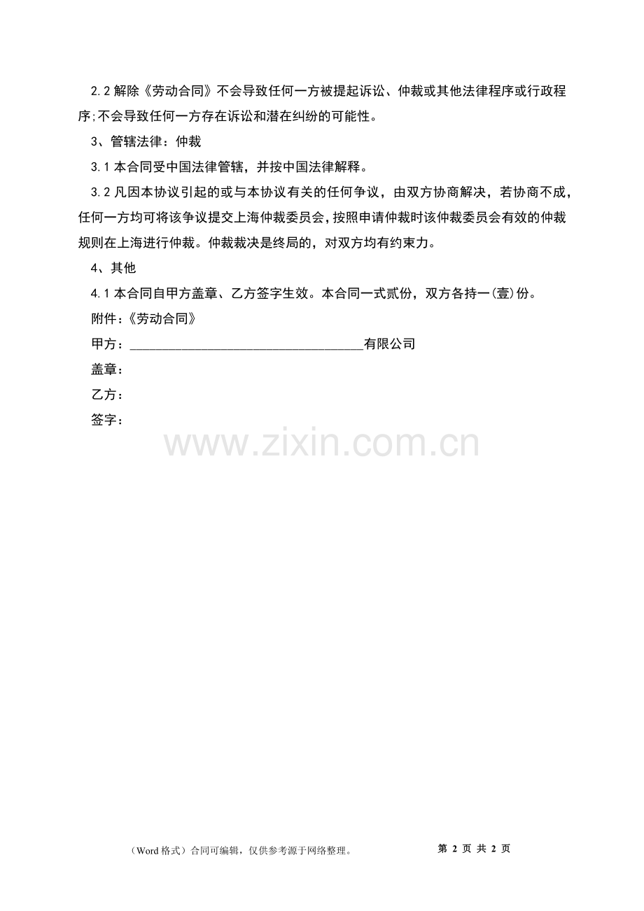 2.2解除《劳动合同》不会导致任何一方被提起诉讼、仲裁或其他法律程序或行政程序;不会导致任何一方存在诉讼和潜在纠纷的可能性。