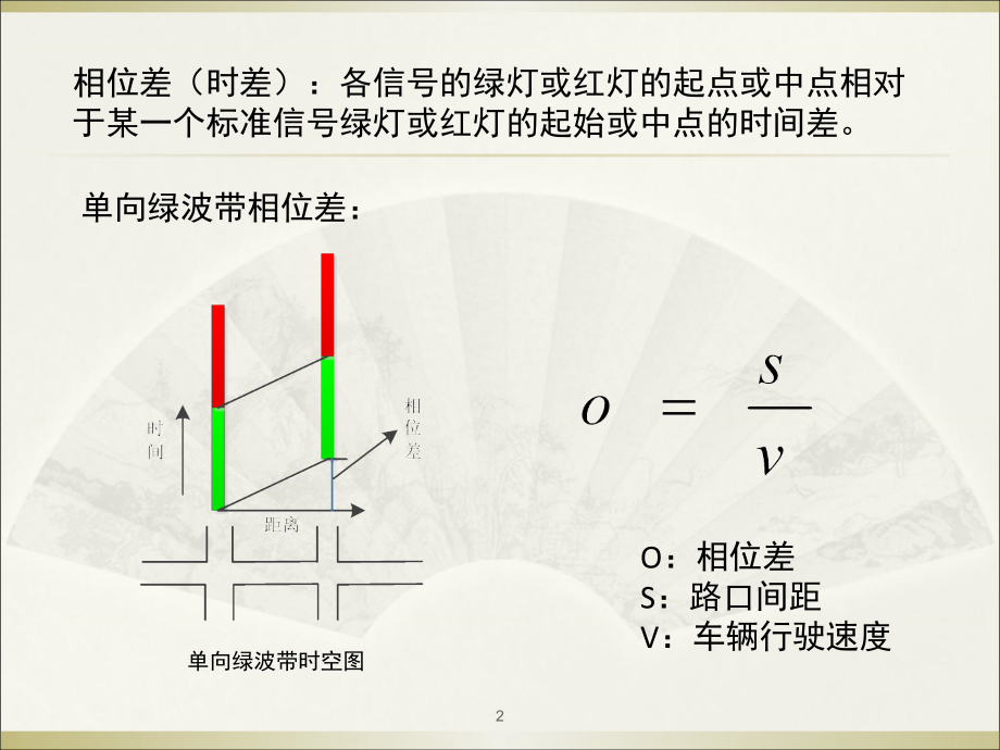 ,单击此处编辑母版标题样式,单击此处编辑母版文本样式,第二级,第三级,第四级,第五级,*,单击此处编辑母版标题样式,单击此处编辑母版文本样式,第二级,第三级,第四级,第五级,*,单击此处编辑母版标题样式,单击此处编辑母版文本样式,第二级,第三级,第四级,第五级,*,单击此处编辑母版标题样式,单击此处编辑母版文本样式,第二级,第三级,第四级,第五级,*,单击此处编辑母版标题样式,单击此处编辑母版文本样式,第二级,第三级,第四级,第五级,*,单击此处编辑母版标题样式,单击此处编辑母版文本样式,第二级,第三级,第四级,第五级,*,单击此处编辑母版标题样式,单击此处编辑母版文本样式,第二级,第三级,第四级,第五级,*,单击此处编辑母版标题样式,单击此处编辑母版文本样式,第二级,第三级,第四级,第五级,*,单击此处编辑母版标题样式,单击此处编辑母版文本样式,第二级,第三级,第四级,第五级,*,单击此处编辑母版标题样式,单击此处编辑母版文本样式,第二级,第三级,第四级,第五级,*,干线协调控制设计及其,Vissim,仿真,学校:北方工业大学,姓名:*科,1,相位差(时差):各信号的绿灯或红灯的起点或中点相对于某一个标准信号绿灯或红灯的起始或中点的时间差。,单向绿波带相位差:,单向绿波带时空图,O,:相位差,S,:路口间距,V,:车辆行驶速度,2,双向绿波带相位差:,双向绿波带时空图,由于要顾虑双个方向的绿波带宽,相位差求解变得复杂,主要求解方法有:图解法、数解法、MAXBAND,等。,3,图解法求取相位差设计绿波带,以上饶市凤凰大道三个路口为例。,需要数据:,1.,各路口的间距:,1-2,路口,296m,,,2-3,路口,528m,;,2.,路段上的车辆平均速度:,1-3 30km/h ,3-1 20km/h,;,3.,根据各路口的实际流量计算好的配时方案。,路口,1,路口,2,路口,3,协调相位绿信比,(%),38,61,37,4,5,图解法的步骤:,画出时空图坐标轴;,确定各路口是采用交互式协调还是同步式协调;,按配时方案调节绿信比;,调节车速寻找合适的绿波带宽;,求出相位差。,6,首先画出时空图坐标轴。(推荐使用,Visio,画图软件),1.,画出时空图坐标轴,7,公共周期,选择最大周期(,154s,)。先以,协调相位,绿信比为,50%,,在纵轴上画好第一个路口的各周期内的绿灯时段。(时空图的纵轴代表时间,横轴代表距离),2.,确定各路口是采用交互式协调还是同步式协调,8,从原点画出,速度斜线,与路口,2,的纵轴相交。,9,交点,A,离坐标轴比较接近,所以路口,2,选择,同步式协调。,10,为路口,2,画上绿灯时段。,11,继续延长速度斜线与第三路口相交于,B,,,B,更接近第一条虚线,个选择,交互式协调。,12,为路口,3,画上绿灯时段。,13,绘出正向绿波带宽。,14,绘出反向绿波带宽。,15,根据配时方案的绿信比修改路口,1,的绿灯时段。(绿灯时段的两边分别减小个,1.2,刻度),3.,按配时方案调节绿信比,16,同理修改路口,2,、,3,的绿灯时段。,17,调整绿波带速度使得绿波带宽更大。,最后求得相位差依次为:,9s,、,-9s,、,86s,。,4,、,5.,调节车速寻找合适的绿波带宽,求出相位差,18,1.,图解法灵活性极高。只要绘制的时空图符合实际情况(速度、绿信比、周期),可自由调整时空图(间距一般不修改)来求出相应的相位差。,2.,想使用图解法绘制出不错的相位差,需要对时空图一定的了解,这需要大量的练习才可获得,希望同学们多多努力。,19,在,vissim,中设置相位差。首先选择信号控制菜单进入信号配时界面。,20,分别为,3,个路口的配时方案设置相位差,offset,。由于,vissim,相位差不能输入负值,则计算的相位差改为:,18s,、,0s,、,95s,。,21,作业,:,1.,各小组以调查的路口设计绿波带并利用,Vissim,仿真。,要求:写出相位差的求解过程,并有设计绿波带前后干线的评价指标(延误、停车次数),2.,选取一个路口进行感应控制仿真。(选作),22,