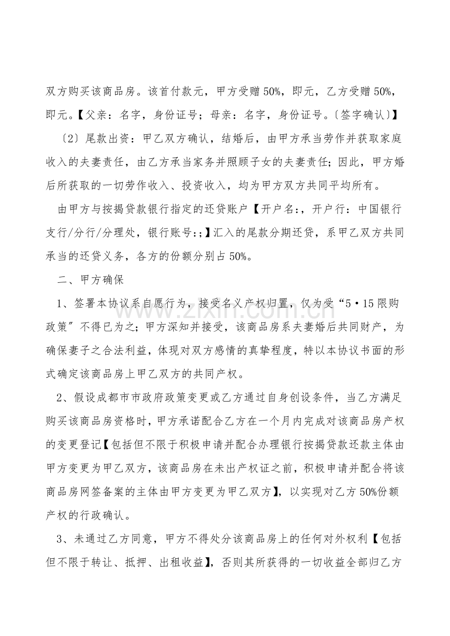 甲、乙双方系中国合法登记夫妻,2018年月日双方以甲方的名义向购买有位于四川省成都市XXX区XX路XX号XXX小区栋单元号商品房〔以下简称“该商品房〞〕一套,该合同的编号为〔假设没有可删〕;鉴于受2018年5月15日成都市人民政府公布施行的《成都市人民政府办公厅关于进一步完善我市房地产市场调控政策的通知》〔以下简称“5·15限购政策〞〕的限制,双方自愿对该商品房的权属作以下约定: