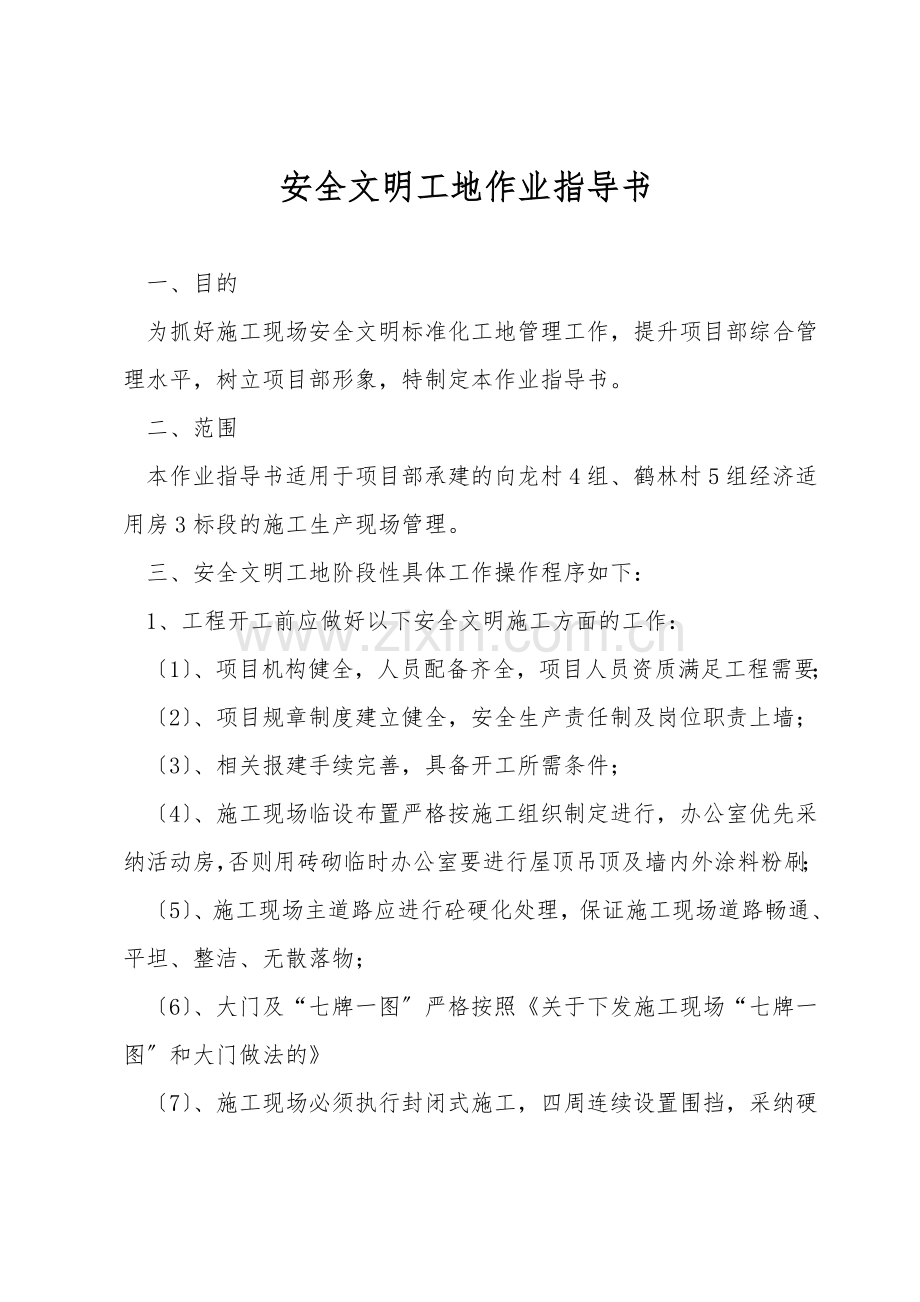 为抓好施工现场安全文明标准化工地管理工作,提升项目部综合管理水平,树立项目部形象,特制定本作业指导书。