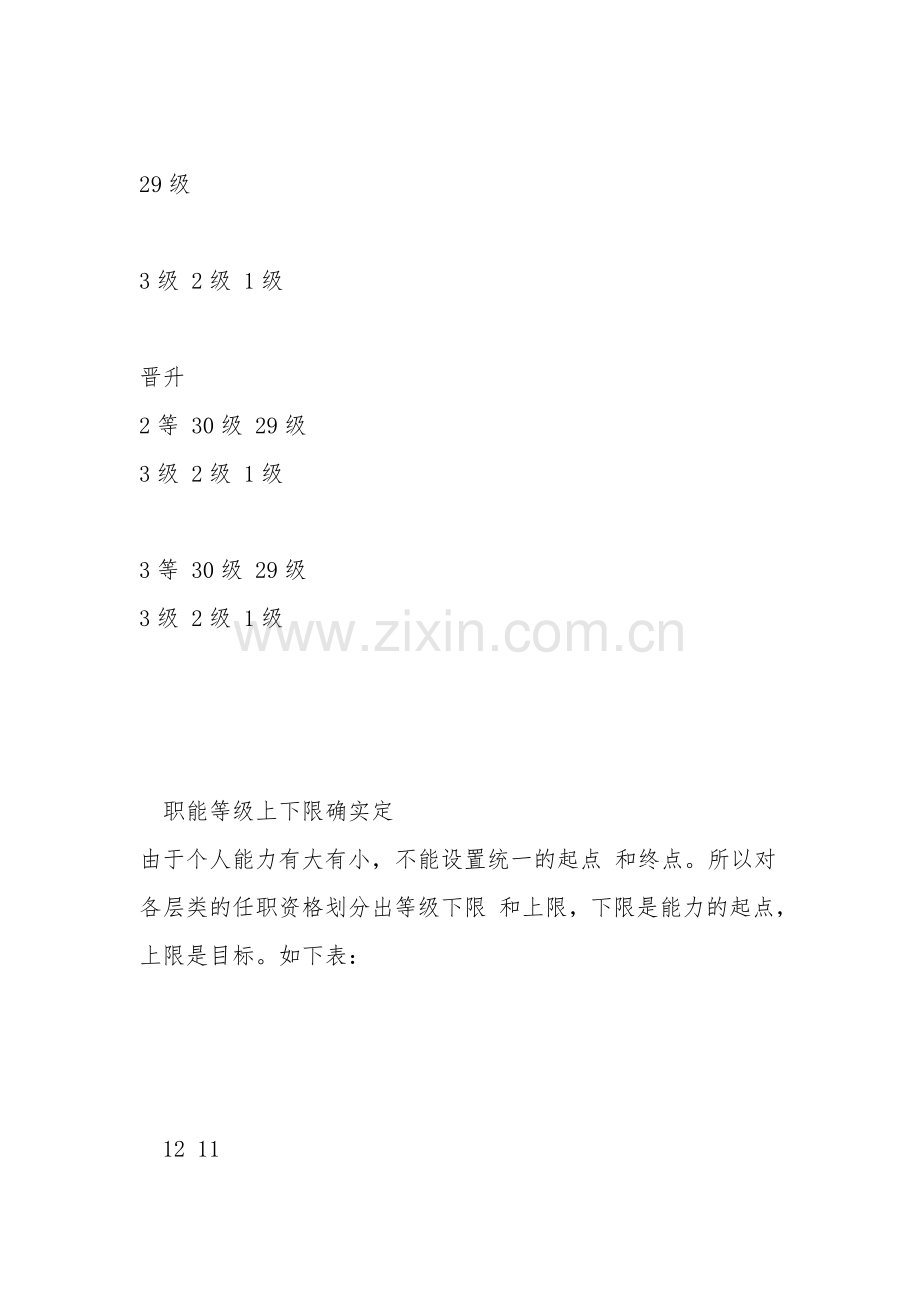 由于个人能力有大有小,不能设置统一的起点 和终点。所以对各层类的任职资格划分出等级下限 和上限,下限是能力的起点,上限是目标。如下表: