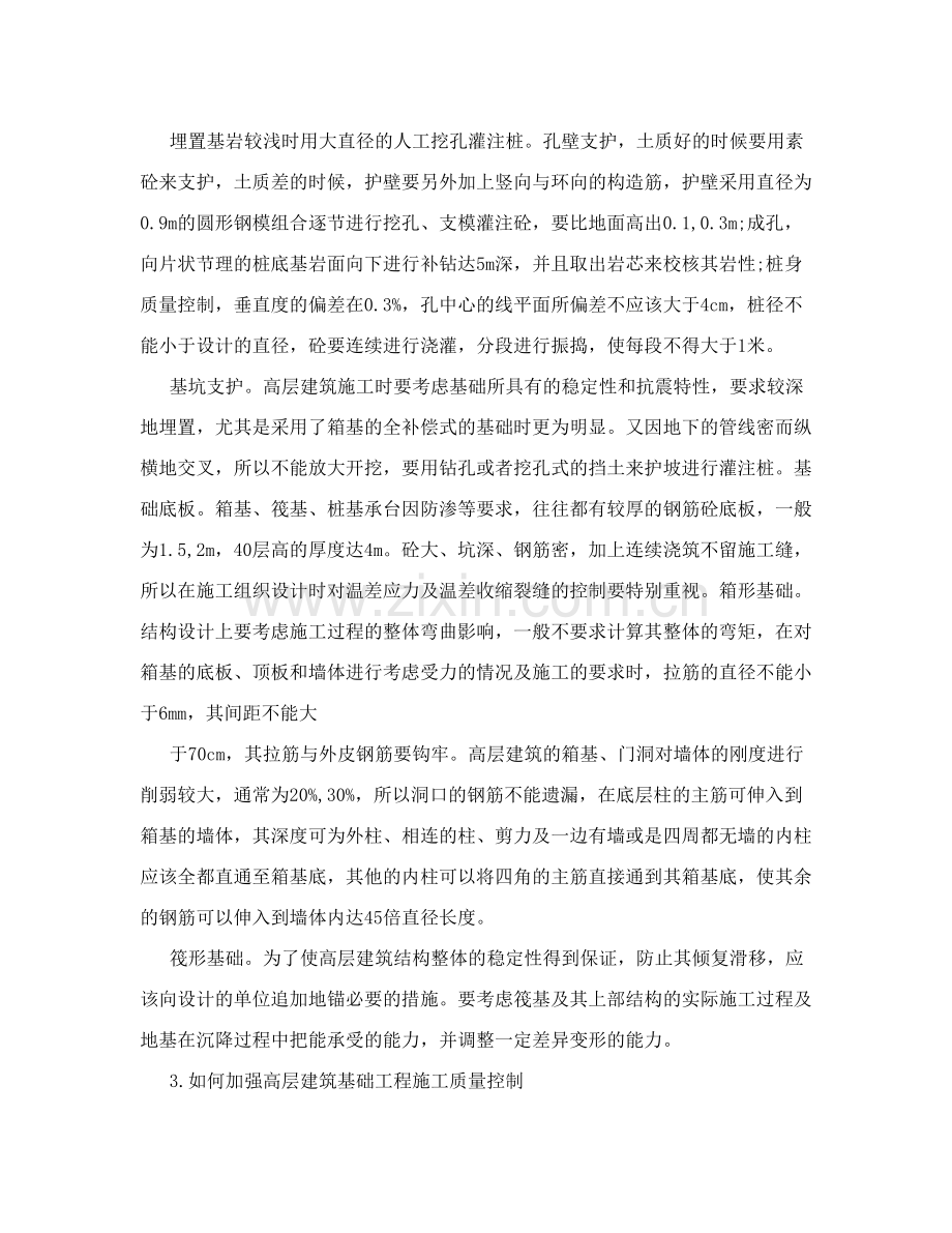 摘要:高层建筑日益形成城市的建筑主体,其基础施工有较强的抗震性、抗倾翻性和抗压性等,新的材料、新的技术和新的工艺被广泛地应用,高层建筑基础施工的质量关系着高层建筑的寿命。本文就高层建筑基础工程施工质量控制要点进行了深入的探讨,提出了自己的看法和建议,具有一定的参考价值。