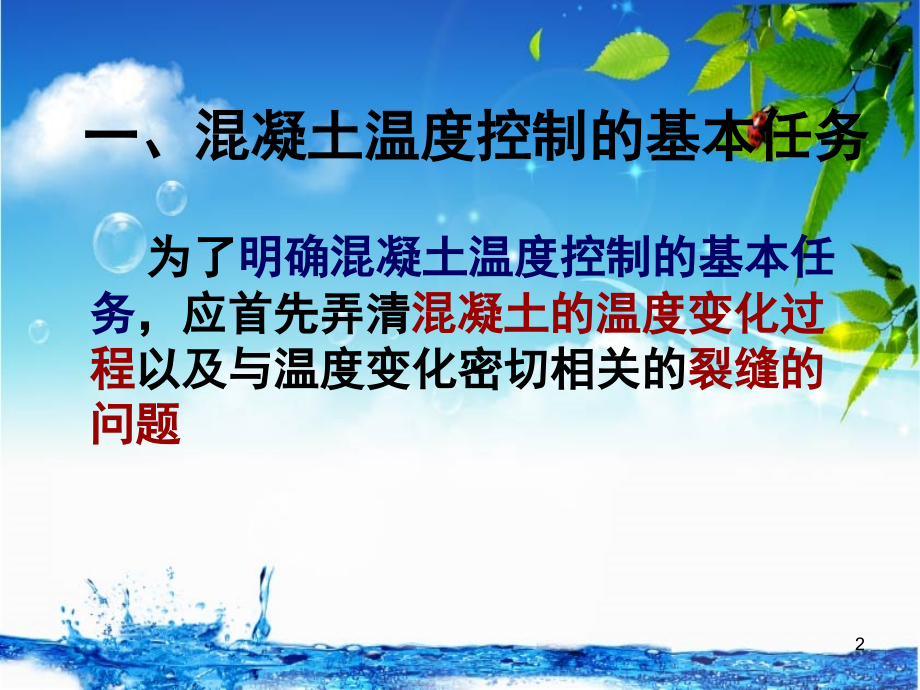 按一下以編輯母片標題樣式,按一下以編輯母片,第二層,第三層,第四層,第五層,*,第四节 混凝土的温度控制与分缝分块,混凝土温度控制,1,一、混凝土温度控制的基本任务,为了,明确混凝土温度控制的基本任务,,应首先弄清,混凝土的温度变化过程,以及与温度变化密切相关的,裂缝的问题,2,(一)混凝土的温度变化过程,混凝土在凝固过程中,由于,水泥水化,,,释放大量水化热,,使混凝土内部温度逐步上升。,对大体积混凝土,大部分水化热将积蓄在浇筑块内,,使块内温度达,30,50,,,甚至更高。,由于内外温差的存在,随着时间的推移,,坝内温度逐渐下降而趋于稳定,与多年平均气温接近,。,3,大体积混凝土的温度变化过程,可分为三个阶段,即,温升期、冷却期(或降温期)和稳定期,大体积混凝土的温度变化过程线,4,混凝土内的最高温度,T,max,等于混凝土浇筑入仓,T,P,与水化热温升值,T,r,之和。,由,T,P,到,T,max,是温升期,由,T,max,到稳定温度,T,f,是降温期,之后混凝土体内温度围绕稳定温度随外界气温略有起伏。,5,Tmax,与,Tf,之差称混凝土体的最大温差,记为,T,。要确定,Tmax,,须先根据水泥品种和用量,确定水泥水化热引起的温升,Tr,,同时还须确定混凝土的入仓温度,T,P,。,T,P,的值等于:,TP=Tb+t,式中,t,混凝土自出拌和机到入仓的温度变化值,。,Tb,混凝土的拌和温度,。,6,(二)温度应力与温度裂缝,大体积混凝土的温度应力,是由于变形受约束而产生:,基础混凝土在降温过程中受基岩或老混凝土的约束;,由非线性温度场引起各单元体之间变形不一致的内部约束;,在气温骤降情况下,表层混凝土的急剧收缩变形,受内部热胀混凝土的约束等。,7,由于混凝土的,抗压强度远高于抗拉强度,,在温度压应力作用下不致破坏的混凝土,当受到温度拉应力作用时,常因抗拉强度不足而产生裂缝。,随着约束情况的不同,大体积混凝土温度裂缝有如下两种:,表面裂缝,贯穿裂缝和深层裂缝,8,1,、表面裂缝,混凝土浇筑后,其内部由于水化热温升,体积膨胀,如受到岩石或老混凝土约束,在初期将产生较小的压应力,当混凝土温度继续下降时,混凝土块内将出现较大的拉应力,但混凝土的强度和弹模随龄期而增长,只要对基础块混凝土进行适当的温度控制即可防止开裂。,但遇,寒潮,气温骤降,,表层降温收缩,内胀外缩,在混凝土,内部产生压应力,表层产生拉应力,。,9,当表层温度拉应力超过混凝土的允许抗拉强度时,将产生裂缝,形成表面裂缝,其深度不超过,30cm,。,特点:,这种裂缝多发生在浇筑块侧壁,方向不定,短而浅,数量较多。随着混凝土内部温度下降,外部气温回升,有重新闭合的可能。,10,大量工程实践表明,混凝土坝温度裂缝中绝大多数为表面裂缝,且大多数表面裂缝是在混凝土浇筑初期遇气温骤降等原因引起的,少数表面裂缝是由于中后期受年变化气温或水温影响内外温差过大造成的。,表面保护是防止表面裂缝的最有效措施,特别是混凝土浇筑初期内部温度较高时由为注意表面保护。,11,2,、贯穿裂缝和深层裂缝,变形和约束是,产生应力的两个必要条件。,由于混凝土浇筑温度过高,加上混凝土的水化热温升,形成混凝土的最高温度,当降到施工期的最低温度或降到水库运行期的稳定温度时,即产生,基础温差,,,由这种均匀降温产生混凝土裂缝,这种裂缝是混凝土的变形受外界约束而发生的,所以它整个端面均匀受拉应力,一旦发生,就形成,贯穿性裂缝,。,12,由温度变化引起温度变形是普遍存在的,有无温度应力出现的,关键在于有无约束,。,人们把基岩、老混凝土视为刚性基础。这种基础对新浇不久的混凝土产生温度变形所施加的约束作用,称为,基础约束,。这种约束在混凝土,升温膨胀期引起压应力,,在,降温收缩时引起拉应力,。当此拉应力超过混凝土的极限抗拉强度时,就会产生裂缝,称为,基础约束裂缝,。,13,由于这种裂缝自基础面向上开展,严重时可能贯穿整个坝段,故又称为,贯穿裂缝,。,此种裂缝宽度随气温变化很敏感;表面宽度沿延伸方向的变化也是很明显的。此外,裂缝在接近基岩部位和顶端,都是逐渐尖灭的。切割的深度可达,3,5m,以上,故又称为,深层裂缝,。裂缝的宽度可达,1,3mm,,且多垂直基面向上延伸,既可能平行纵缝贯穿,也可能沿流向贯穿。,14,(三)大体积混凝土温度控制的任务,首要任务,是通过控制混凝土的拌和温度来控制混凝土的,入仓温度,;再通过一期冷却来降低混凝土内部的,水化热温升,,从而降低混凝土内部的最高温升,,使温差降低到允许范围,。,另一任务是通过二期冷却,使,坝体温度从最高温度降到接近稳定温度,,以便在达到,灌浆温度,后及时进行纵缝灌浆。,15,(四)大体积混凝土温度控制标准,温度控制标准实质上就是,将大体积混凝土内部和基础之间的温差控制在基础约束应力,小于混凝土允许抗拉强度以内,,即,式中,p,混凝土的抗拉强度,,Pa,;,K,安全系数,一般取,1.3,1.8,,工程等级高的取大值,等级低的取小值。,16,控制混凝土的极限拉伸值。,当下层混凝土龄期超过,28,天成为老混凝土时,其上层混凝土浇筑应控制上、下层温差,温差要求上下层温差值不大于,15,20,。,确定灌浆温度是温控的又一标准。,17,三、大体积混凝土的温度控制措施,温度控制的具体措施常从混凝土的,减热和散热,两方面着手。,减热就是减少混凝土内部的发热量,如降低混凝土的拌和出机温度,以降低入仓浇筑温度,Tp,;减少混凝土