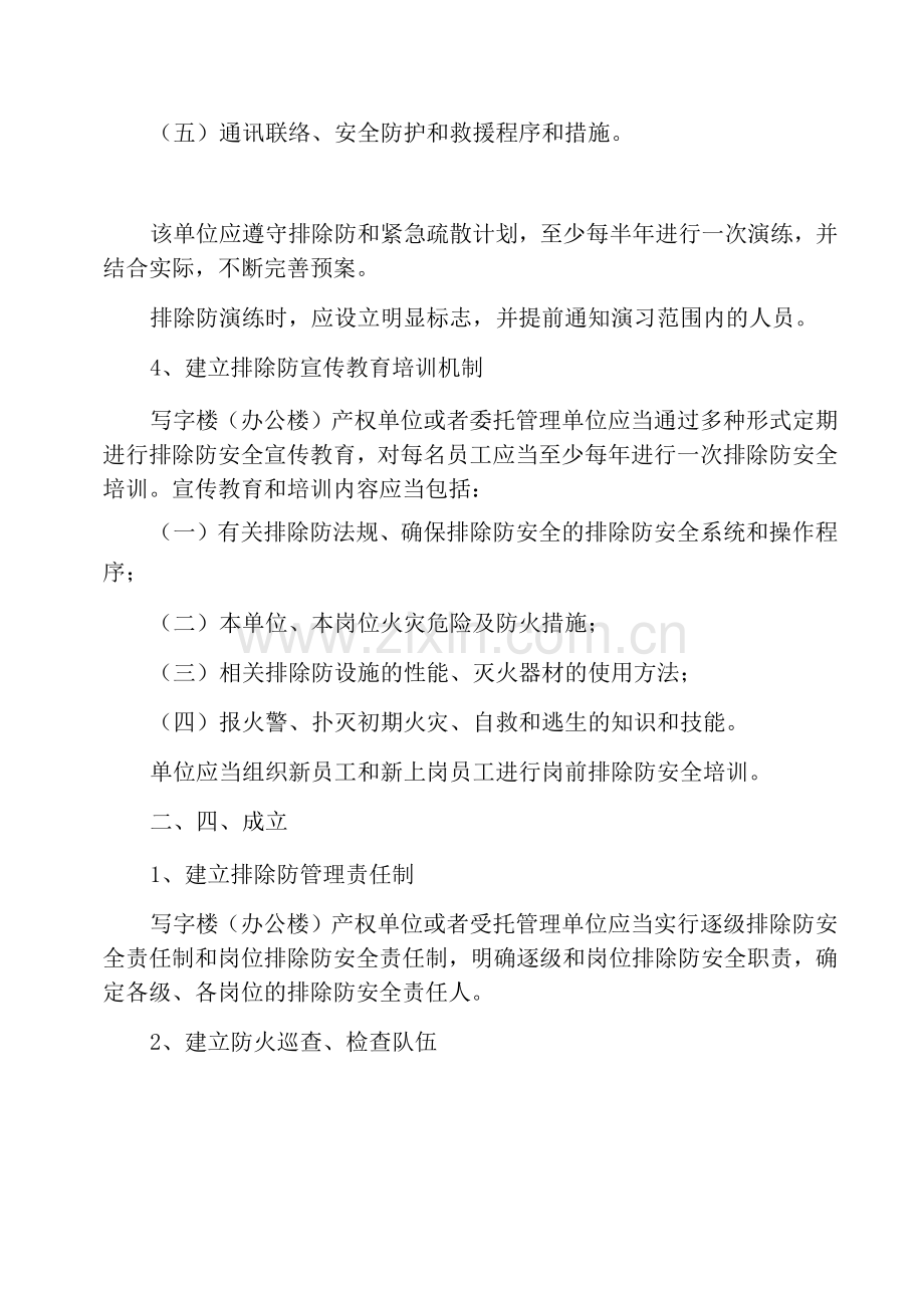 写字楼(办公楼)产权单位和受托管理单位应当遵守国家有关规定,结合本单位的特点,建立健全各项确保排除防安全的排除防安全系统和操作程序,并公布执行。