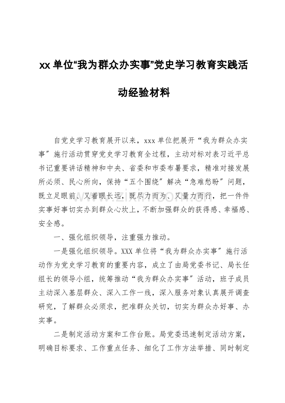 xx单位“我为群众办实事”党史学习教育实践活动经验材料