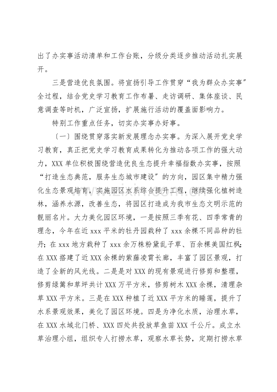 〔一〕围绕贯穿落实新发展理念办实事。为深入展开党史学习教育,真正把党史学习教育成果转化为推动各项工作的强大动力,XXX单位积极围绕营造优良生态提升幸福指数办实事,按照“打造生态典范,服务生态城市建设〞的方向,园区集中精力强化生态景观培育,实施园区水系综合提升工程,继续强化植树造林,涵养水源,改善生态,将园区打造成为我市生态文明示范的靓丽名片。大力美化园区环境,一是按照三季有花、四季常青的理念,今年在近xxx平米的牡丹园栽种了xxx余棵不同品种的牡丹;在xxx地方栽种了xxx余万株粉黛乱子草、百余棵美国红枫;在XXX搭建了近XXX余棵的紫藤凌霄长廊,丰富了园区景观,打造了全新的风光线。二是是对XXX的现有景观进行修剪和整理,修剪绿篱和草坪共计XXX万平方米,修剪树木XXX余棵,清理杂草XXX平方米。三是在XXX种植了近XXX平方米的睡莲,提升了水系景观效果,美化了园区环境。四是为净化水质,治理水草,在XXX水域北门桥、XXX四处共投放草鱼苗XXX千公斤。成立水草治理小组,组织专人打捞水草,观察水草长势,定期打捞水草及水面垃圾XXX余吨,坚持水面清洁。