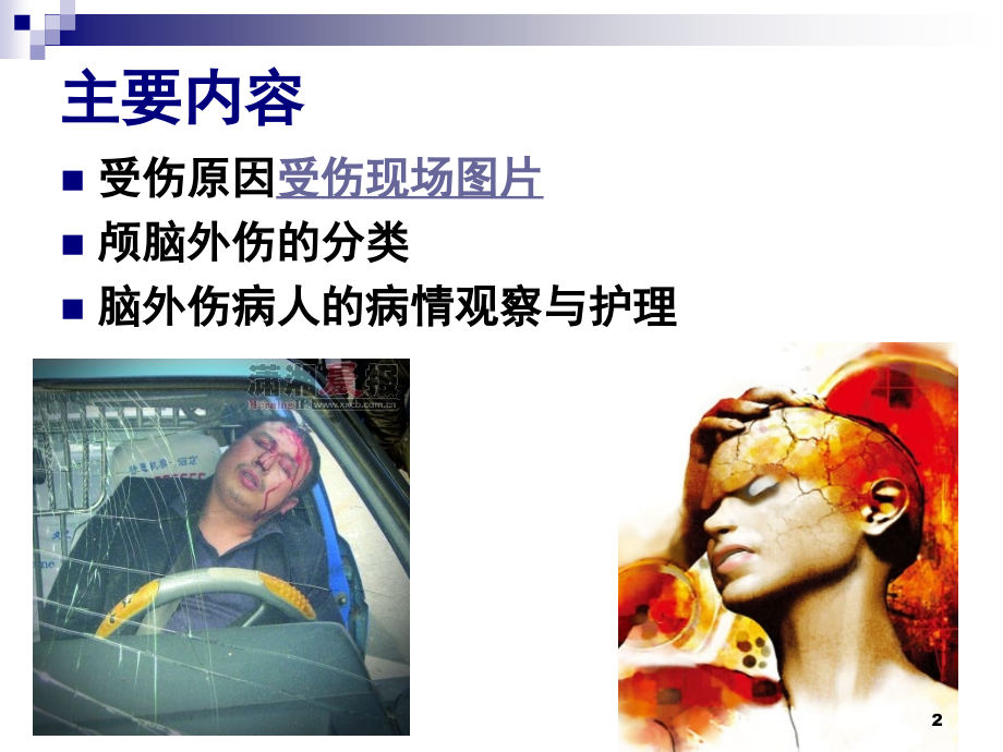 ,*,单击此处编辑母版标题样式,单击此处编辑母版文本样式,第二级,第三级,第四级,第五级,单击此处编辑母版标题样式,单击此处编辑母版文本样式,第二级,第三级,第四级,第五级,*,颅脑外伤病人的病情观察与护理,1,主要内容,受伤原因,受伤现场图片,颅脑外伤的分类,脑外伤病人的病情观察与护理,2,颅脑外伤的种类,头皮损伤:头皮血肿、头皮裂伤、头皮撕脱伤,颅骨损伤:按骨折形态:线形骨折,凹陷性骨折,颅盖骨骨折,按骨折部位:颅前窝骨折,颅底骨折 颅中窝骨折,颅后窝骨折,脑损伤:开放性脑损伤和闭合性脑损伤,原发性脑损伤和继发性脑损伤,(,脑震荡、脑挫裂伤、原发性脑干损伤、下丘脑损伤,),颅内血肿,(,硬脑膜外血肿、硬脑膜下血肿、脑内血肿,),3,生理结构,4,脑外伤,-,头皮血肿,定义:头皮被钝器撞击引起的头皮软组织闭合性损伤。头皮富含血管,遭受钝性打击或者碰撞后可使组织血管破裂出血,而头皮仍属完整。按血肿形成部位不同分为皮下血肿、帽状腱膜下血肿和骨膜下血肿。皮下血肿体积小,张力高,疼痛十分显著;帽状腱膜下血肿张力低,范围貌似一顶帽子,疼痛较轻,有贫血外貌;骨膜下血肿多伴有颅骨线性骨折,疼痛显著,以骨缝为界,范围局限于某一部分颅骨。,处理原则:伤后,48,小时内冷敷可减轻疼痛,疼痛剧烈者可遵医嘱适当给予止痛药物 婴幼儿巨大帽状腱膜下血肿可导致休克发生,需密切观察病情变化,协助医生行血肿穿刺抽吸,并给予抗生素治疗 同时做好休克相关护理,如平卧、保暖、吸氧等,5,脑外伤,-,头皮裂伤,定义:是由锐器或钝器直接作用于头皮所致损伤。头皮血管丰富,头皮裂伤出血较多,不易自止,易导致血容量不足;头皮含有大量毛囊、汗腺和皮脂腺,容易隐藏污垢、细菌,损伤后容易导致感染。所幸,头皮血液循环十分丰富,虽然头皮发生裂伤,只要能够及时施行彻底的清创,感染并不多见。,处理原则:伤后,48,小时内冷敷可减轻疼痛,疼痛剧烈者可遵医嘱适当给予止痛药物;,协助医生行清创缝合术,观察伤口,有无渗血、渗液及红肿热痛等感染征象。,6,脑外伤,-,头皮撕脱伤,定义:,常因头发卷入机器而使大块头皮自帽状腱膜下或连同颅骨骨膜一并撕脱。伤后可因大量出血及疼痛而发生休克,女性多见。,处理原则:,疼痛剧烈者可遵医嘱适当给予止痛药物;协助医生行清创缝合术,观察伤口,有无渗血、渗液及红肿热痛等感染征象,,避免压迫创伤局部,可取坐位。,7,脑外伤,-,颅盖骨骨折,定义:,常因暴力直接作用于颅盖骨所致。其发生率以顶骨及额骨为多,枕骨和颞骨次之。颅盖骨折有,3,种主要形态,即线性骨折、粉碎性骨折和凹陷骨折,其中以线性骨折最为常见。,处理原则:,颅骨凹陷性骨折诊断明确,,骨折凹陷深度,1cm,,临床出现局灶性,症状或颅内压增高症状者,需行凹陷,骨折整复术。,线性骨折,凹陷性骨折,8,脑外伤,-,颅底骨折,定义:,可由颅骨骨折线延伸或由强烈的间接性暴力作用于颅底所致,常为线性骨折。暴力作用的部位和方向与颅骨骨折线的走向有一定规律。,依发生部位不同可分为:,颅前窝骨折,颅中窝骨折,颅后窝骨折,9,脑外伤,-,颅底骨折,颅前窝骨折,表现,:,为眶周及球结膜下淤血斑,(,熊猫眼,),,脑脊液鼻漏,可合并嗅神经、视神经损伤症状,10,脑外伤,-,颅底骨折,颅中窝骨折,表现,:,为耳后乳突部皮下淤血斑,脑脊液鼻漏、耳漏,常合并面神经、听神经损伤症状,11,脑外伤,-,颅底骨折,颅后窝骨折表现:,可出现乳突部及枕下区皮下淤斑,偶尔合并舌咽、迷走、副、舌下神经损伤症状,12,脑外伤,-,脑震荡,是头部受暴力作用后立即出现短暂的大脑功能障碍,但无明显的脑组织器质性损害。,是原发性脑损伤中最轻的一种,其特点是头部外伤后短暂意识丧失,一般不超过,30,分钟,有逆行性遗忘,常伴有头痛、头晕、呕吐等症状。多数病人在,2,周内恢复正常,预后良好。,处理原则:,卧床休息,12,周,,观察意识状况及自觉症状,,症状显著者可遵嘱予镇静、止痛药物。,13,脑外伤,-,脑挫裂伤,主要指暴力作用于头部,引起大脑皮质的可见性器质性损害,包括脑挫伤和脑裂伤。脑挫伤指脑组织遭受破坏较轻,软脑膜尚完整的损伤,;,脑裂伤指软脑膜、血管和脑组织同时有破裂的损伤,常伴有外伤性蛛网膜下腔出血。脑挫裂伤的继发性改变为脑水肿和血肿形成,处理原则:,解除呼吸道梗阻,防止误吸,降低颅内压,防治脑疝,控制出血,防治休克,14,脑外伤,-,原发性脑干损伤,意识障碍,瞳孔多变,椎体束征,呼吸紊乱,伤后立即昏迷,昏迷较深,持续时间长,瞳孔不等、大小多变,对光反应变化无常,,眼球位置不居中或同向凝视,病理反射、肌张力高、中枢性瘫痪,累及延髓则呼吸循环功能紊乱,(,潮式呼吸、,抽泣样呼吸、呼吸骤停,),15,脑外伤,-,颅内血肿,硬脑膜外血肿,硬脑膜下血肿,脑室出血,16,脑外伤,-,硬脑膜外血肿,是位于颅骨与硬脑膜之间的血肿,多见于颞部,约占外伤性颅内血肿的,30%,,出血多来自脑膜中动脉,少数由静脉窦或板障静脉破裂所致。其中,80%,以上属急性血肿,如及时治疗预后一般较好,。,17,脑外伤,-,硬脑膜下血肿,指位于硬脑膜与蛛网膜之间的血肿,占颅内血肿的,40%,左右,常继发于对冲性脑挫裂伤,出血多来自挫裂的脑实质血管损伤。,18,脑外伤,-,脑室出血,是指脑实质内的血肿,可发生在脑组织的任何部位,占颅内血肿的,5%,左右,好发于额叶及颞叶前端,常为对冲性脑挫裂