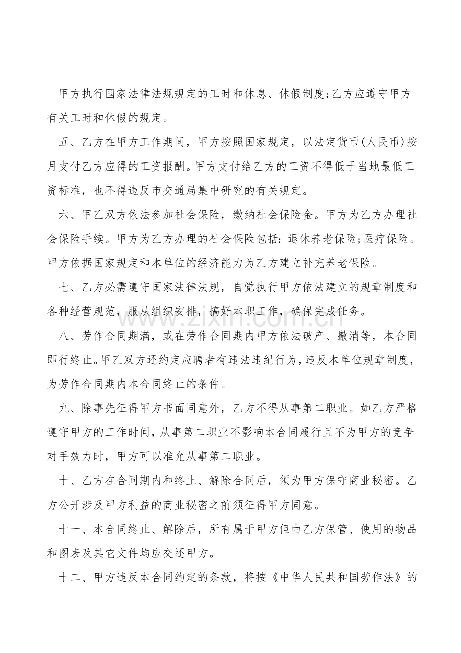 五、乙方在甲方工作期间,甲方按照国家规定,以法定货币(人民币)按月支付乙方应得的工资报酬。甲方支付给乙方的工资不得低于当地最低工资标准,也不得违反市交通局集中研究的有关规定。