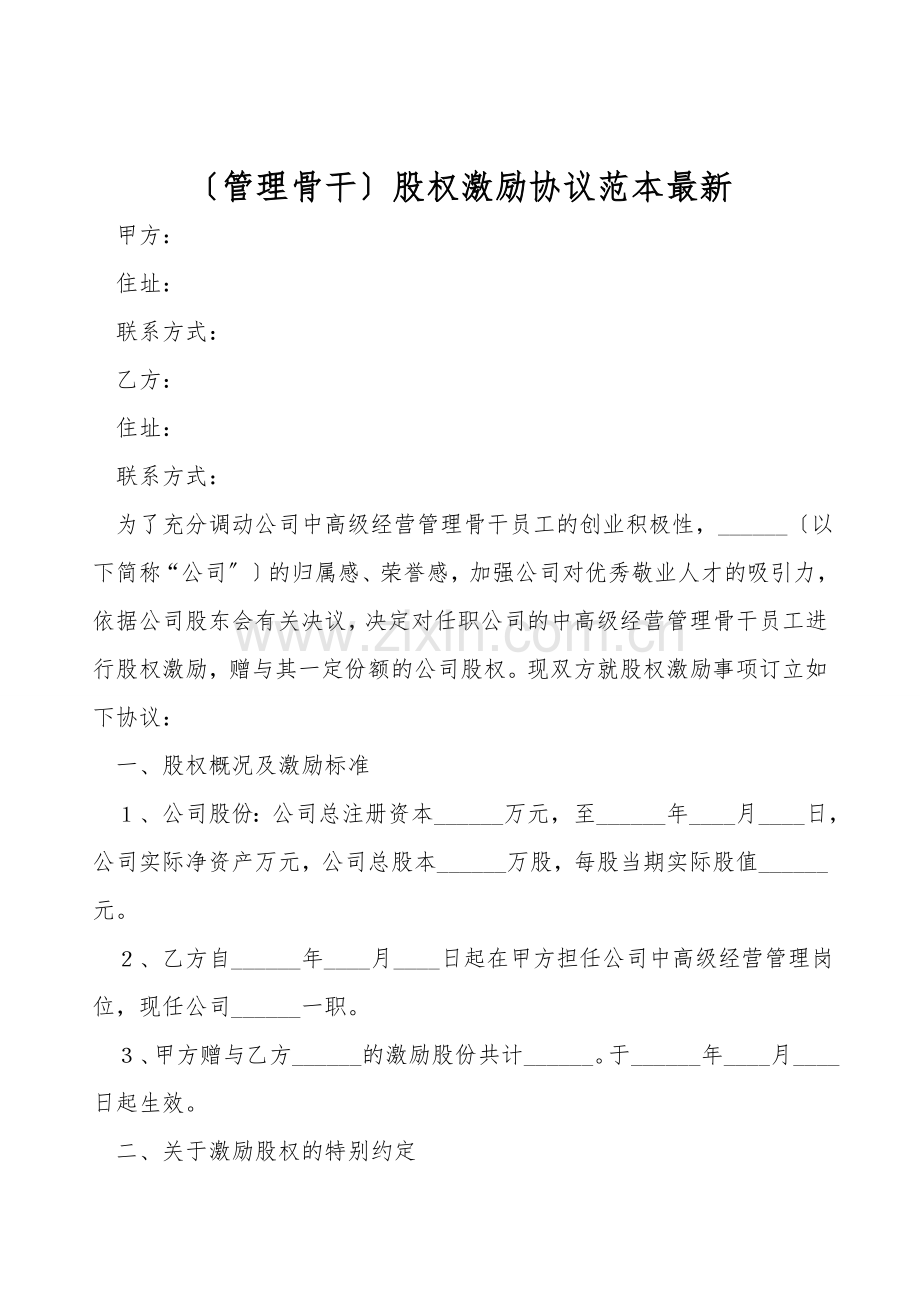〔管理骨干〕股权激励协议范本最新
