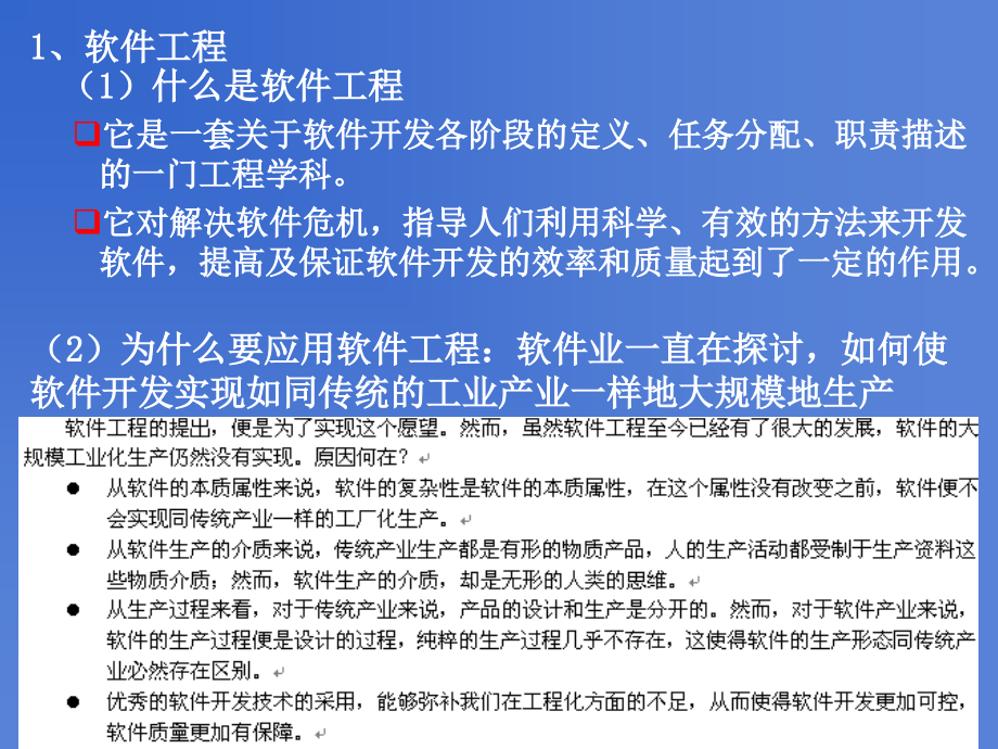 ,软件开发的基本流程,杨少波,njtuyang,软件开发的基本流程,在本讲中的主要知识点,软件工程,软件生命周期的六个阶段,各个阶段的工作重点,各个阶段中人员的角色,Web,网站开发的一般过程,1,、软件工程(,1,)什么是软件工程,它是一套关于软件开发各阶段的定义、任务分配、职责描述的一门工程学科。,它对解决软件危机,指导人们利用科学、有效的方法来开发软件,提高及保证软件开发的效率和质量起到了一定的作用。,(,2,)为什么要应用软件工程:软件业一直在探讨,如何使软件开发实现如同传统的工业产业一样地大规模地生产,2,、软件生命周期的,6,个阶段,(,1,)制订计划阶段(,Plan,),(,2,)需求分析(,Requirements Capture,)阶段,(,3,)系统分析与设计(,System Analysis and Design,),(,4,)系统实现(,Implementation,),(,5,)测试(,Testing,),(,6,)维护(,Maintenance,),体现为是反复迭代,不断完善的开发过程,从系统的需求、总体架构到系统中的各个模块的具体实现,(,3,)在软件工程中所涉及的各个学科内容,软件工程学中包括计算机科学、数学、工程科学和管理科学等方面的知识,其中的计算机科学和数学用于构造模型和算法,而工程科学用于制定规范、设计范型、评估成本及确定权衡,而管理科学则用于计划、资源、质量和成本的管理。,(,1,)系统需求,确定本系统应该具有什么功能(功能性 非功能性以及环境要求)。,主要涉及如何获得用户的需求、描述需求和评审需求,(,2,)系统分析与设计,主要包括,分析需求和系统设计,两个阶段,而这两个阶段是相辅相成、不可分割的。,一般系统设计是在需求分析之后实施的,其中的,系统分析,则主要是明确应该解决什么问题,重点在于理解问题并对理解的结果加以分析,-,涉及对所实现的系统的结构和行为两方面进行分析和理解。,而,系统设计,则是通过某种特定的平台,而达到完成整体软件的功能。主要包括概要设计(静态结构)和详细设计(动态结构),3,、各个阶段的工作重点,这样才能使得系统设计是理性的、切合应用需要的,(,3,)系统实现,重点在于明确所要解决的问题并采用什么技术和手段(语言、工具、开发平台等)来实现前面的设计方案以满足用户的需求(也即通常的编程阶段)。,(,4,)系统测试(功能、性能和接口、界面等方面),在此阶段主要是通过各种测试思想、方法和工具的具体应用,从而找出系统中各种隐藏的缺陷,最后使软件的,Bug,降低到最低。,一般包括单元测试和集成测试等形式(测试报告的格式:编号、功能名称、使用部门、使用岗位、功能描述、输入、期望的输出)。,(,5,)系统部署,(,6,)系统交付和维护,此第五步和后面的第六步在应用中也可以“合二为一”,4,、开发过程中其它所应该考虑的问题,(,1,)项目中所应该考虑的一些问题的技术实现,项目容量的考量和评估,相关风险评估:风险即是以下三个要素发生的机会(威胁,-,事件或行为,一般来自系统外部,可能在某些地方会影响系统中固有的弱点并最终造成一定的影响;弱点,-,系统内部考虑之中的弱点,可能在某些地方受到威胁所利用;影响,-,短期与长期组织的影响,威胁碰巧利用到了弱点),项目中的安全性技术的实现、,应用服务器选择,异常等错误处理技术、中文处理的问题,对数据库访问的优化和性能,项目开发中的编程规范,-,规范是对过程的约束,标准是对产品的约束、制度是对行为的约束,(,2,)项目开发中团队的组建,因为,人员是项目成功和降低项目开发风险的主要因素,必须加以重视。主要有两种形式的人员划分,(,3,)项目管理:项目管理流程和管理的主要内容,5,、了解各个阶段中的人员的角色,当然,对这些具体的与,IT,项目管理方面的管理理论、方法和技巧的内容,我们目前可以不需要过多地了解,!,人员、管理和技术,按功能模块划分(按照问题域进行拆分,-,纵向划分):人员之间的沟通相对比较少。,按组件的层次划分(按照实现过程进行拆分,-,横向划分):人员之间的沟通相对比较多,此时项目的管理和协调工作比较大。但对人员的技术全面性要求比较低。,6,、,Web,网站建设和开发过程,(,1,)网站建设的过程,一般将网站建设的整个过程共分为五个阶段进行,即,“,网站策划阶段,”,、,“,网站设计阶段,”,、,“,网站制作阶段,”,、,“,网站测试阶段,”,和,“,网站维护阶段,”,。,(,2,)每个阶段的工作内容和重点,请见文档说明,仍然为软件工程的,5,个基本阶段,-,因为,Web,网站只是软件开发中的某一特定类型,(,3,)一般的制作流程,请多关注网站架构分析和设计的内容,总结,:,软件开发中的,“,五个面向,”,-,面向,“,流程,”,分析、面向,“,数据,”,设计、面向,“,对象,”,实现、面向,“,功能,”,测试、面向,“,过程,”,的管理。,1,、子曰:,“,学而不思则罔,思而不学则殆。,”,“,学而时习之,”,2,、,子曰:,“,知之者不如好之者,好之者不如乐之者,”,3,、子曰:,“,三人行,必有我师焉,”,4,、,子曰:,“,我非生而知之者,好古,敏以求之者也,”,本讲的简要回顾,5,、,师者:,“,传道、授业和解惑,”,