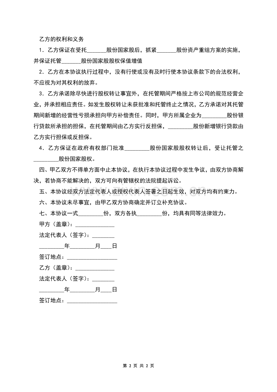 1.乙方保证在受托_______股份国家股后,抓紧_______股份资产重组方案的实施,并保证托管_______股份国家股股权保值增值