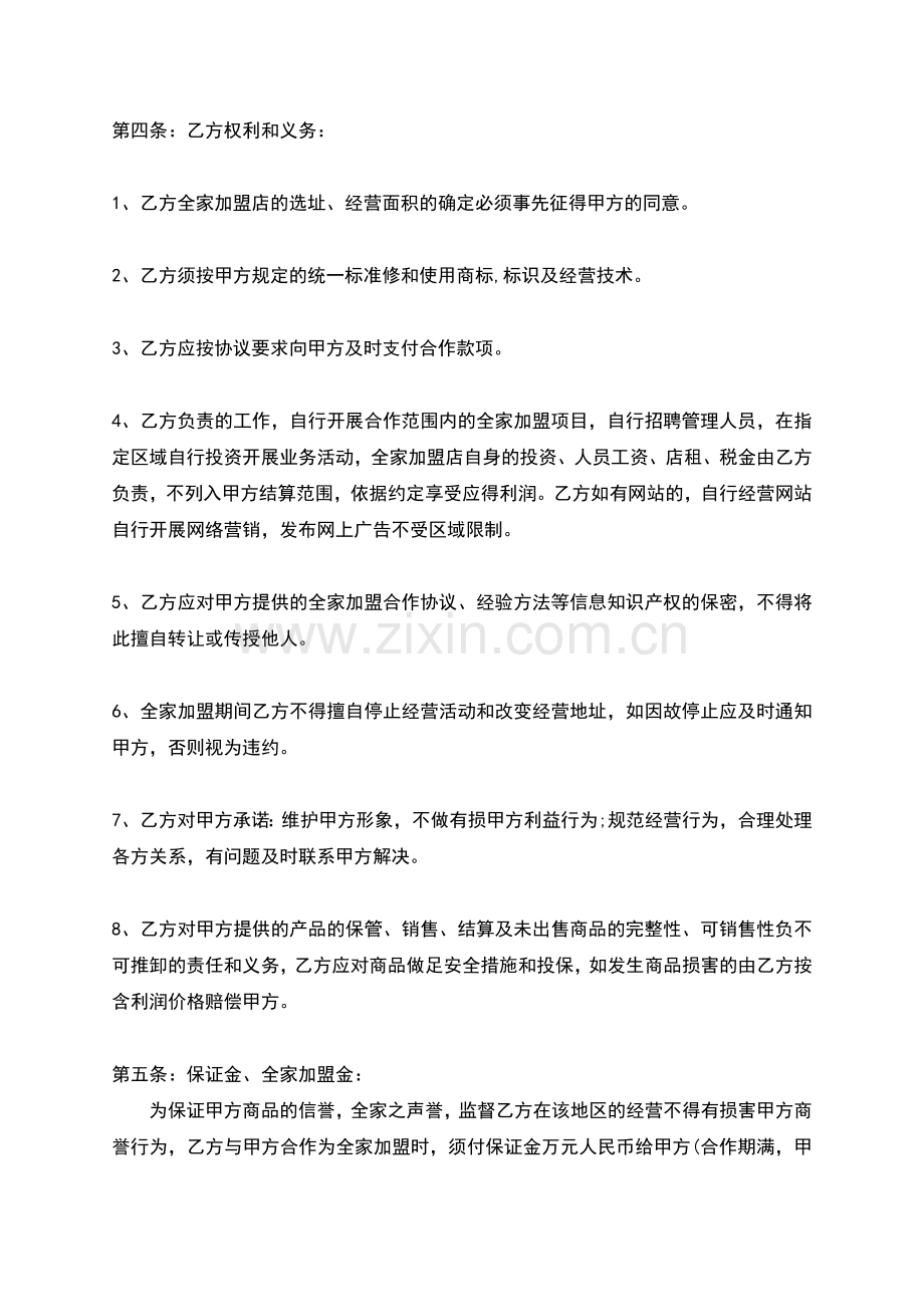 为保证甲方商品的信誉,全家之声誉,监督乙方在该地区的经营不得有损害甲方商誉行为,乙方与甲方合作为全家加盟时,须付保证金万元人民币给甲方(合作期满,甲方把保证金退还给乙方),中途如有违约行为,根据违约责任大小,甲方有权扣下保证金,甚至继续追加必要的法律责任。为保证公司不断致力开发新产品,提高经营管理水平,制定相应的市场销售策略及甲方在产品注册,包设计等无形资产,乙方在加入甲方全家加盟店时,须交全家加盟金万元人民币,以保证甲方利益。