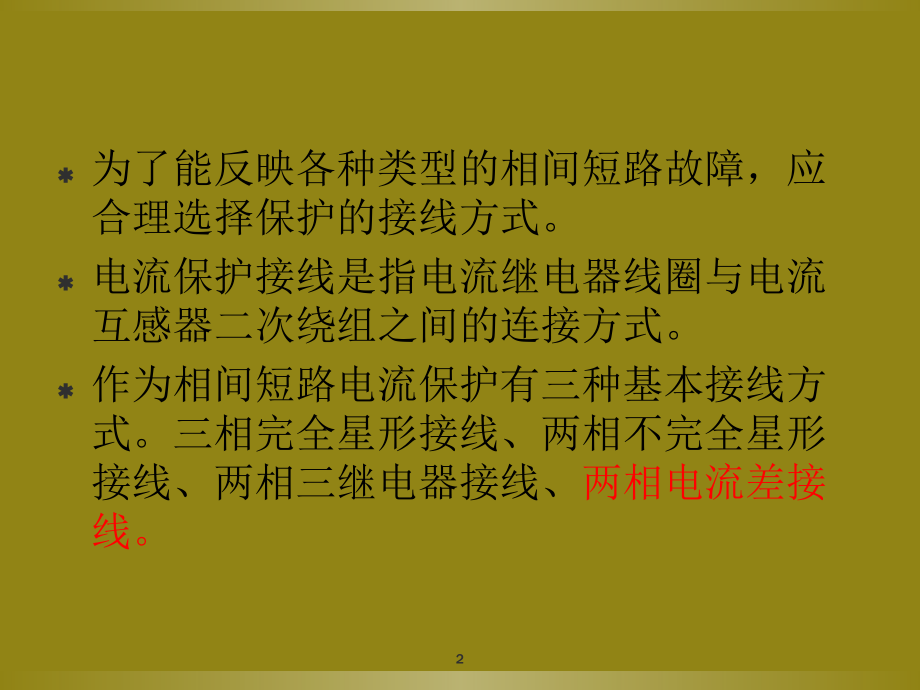 ,单击此处编辑母版标题样式,单击此处编辑母版文本样式,第二级,第三级,第四级,第五级,*,*,电 流 保 护 接 线,1,为了能反映各种类型的相间短路故障,应合理选择保护的接线方式。,电流保护接线是指电流继电器线圈与电流互感器二次绕组之间的连接方式。,作为相间短路电流保护有三种基本接线方式。,三相完全星形接线、两相不完全星形接线、两相三继电器接线、,两相电流差接线。,2,(,1,)三相三继完全星形接线,特点,:,三相电流互感器二次绕组与三个电流继电器分别按相连接,三个继电器触点并联,3,(2),两相两继电器接线,特点,:,只有两相装设电流互感器,按相连接继电器。,4,应用范围:中性点不接地系统。,原因:中性点不接地系统,单相接地属于不正常运行,允许继续运行一段时间。,作用:可提高供电可靠性。,要求:所有线路的电流互感器必须安装在同名相上。,5,只切除一回路示意图,6,切除两回路示意图,1,K,7,保护拒动示意图,8,扩大停电范围示意图,9,结论,:,在两回路上不同地点、不同相别发生两点接地短路时,若保护具有相同的动作时间,采用两相式接线有,2/3,的机会只切除一条回路,这是两相式接线的优点。,若在串联线路上发生两点接地短路,有,1/3,机会误切除近电源的故障点,扩大了停电范围,这是两相式接线的缺点。,10,(,3,)两相三继电器接线,特点:中性上的电流继电器测量到,B,相电流。,11,采用此接线的目的:为了提高,Y,,,d,变压器后发生两相短路的灵敏度。,因为变压器后两相短路,电源侧三相短路电流大小不相等,最大相是最小相的,2,倍。,若采用两相两继电器接线,有可能无法测量到最大相的电流,保护的灵敏度将受到影响。,12,结论:采用两相三继电器接线,可测量到三相短路电流,所以灵敏度得到提高,广泛应用于,Y,,,d,接线变压器的远后备保护。,13,电流保护三种接线方式应用条件不同,:,中性点直接接地系统应采用三相三继电器接线;,两相不完全星形接线较为简单,主要应用在,35kV,及以下电压等级的电网中,作为相间短路的保护。为了提高,Yd11,接线变压器后两相短路时过电流保护的灵敏度,通常采用两相三继电器接线。,两相电流差接线方式接线简单,投资少,但是灵敏性较差,这种接线主要用在,610kV,中性点不接地系统中。,14,