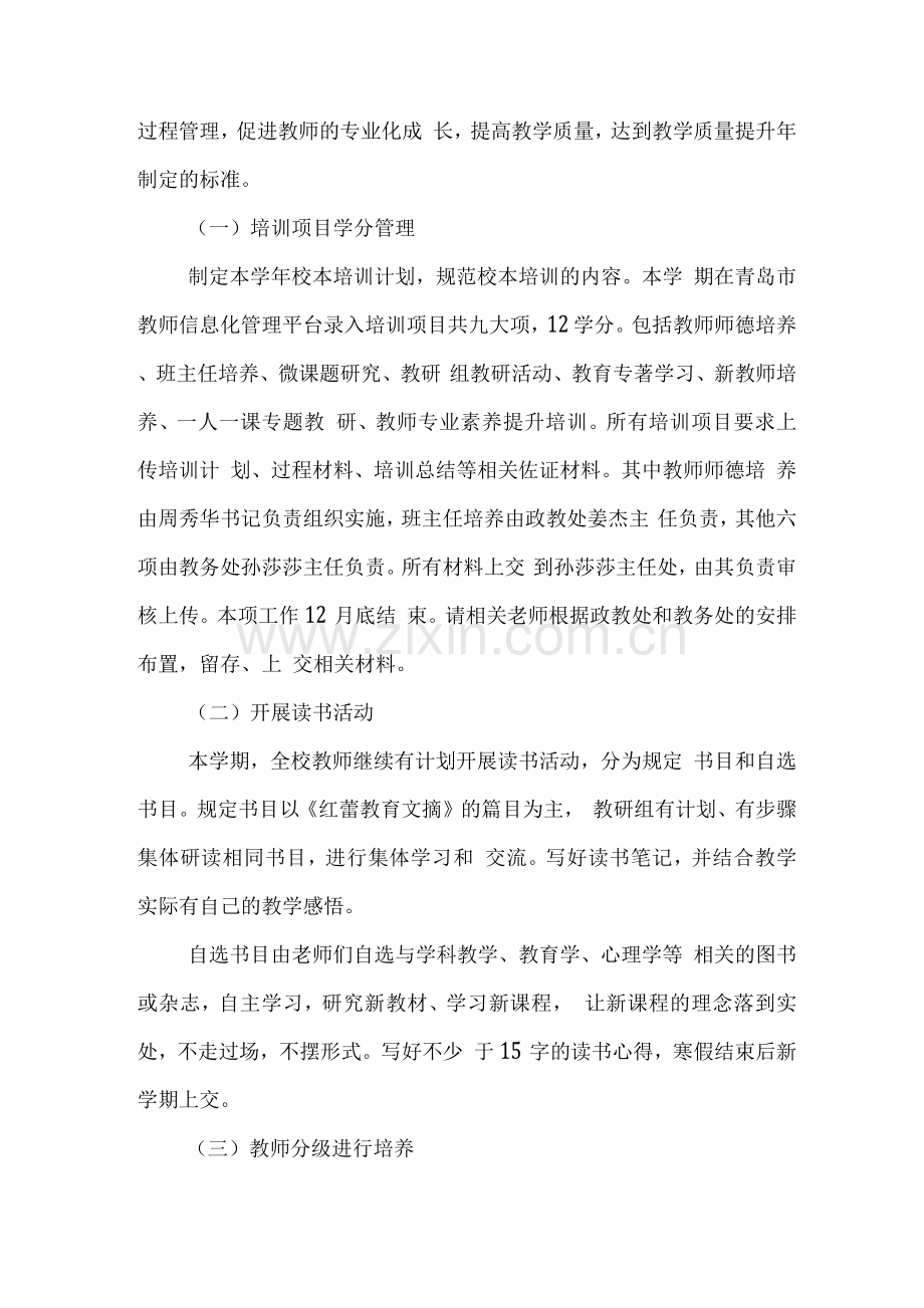 制定本学年校本培训计划,规范校本培训的内容。本学 期在青岛市教师信息化管理平台录入培训项目共九大项,12 学分。包括教师师德培养、班主任培养、微课题研究、教研 组教研活动、教育专著学习、新教师培养、一人一课专题教 研、教师专业素养提升培训。所有培训项目要求上传培训计 划、过程材料、培训总结等相关佐证材料。其中教师师德培 养由周秀华书记负责组织实施,班主任培养由政教处姜杰主 任负责,其他六项由教务处孙莎莎主任负责。所有材料上交 到孙莎莎主任处,由其负责审核上传。本项工作12月底结 束。请相关老师根据政教处和教务处的安排布置,留存、上 交相关材料。