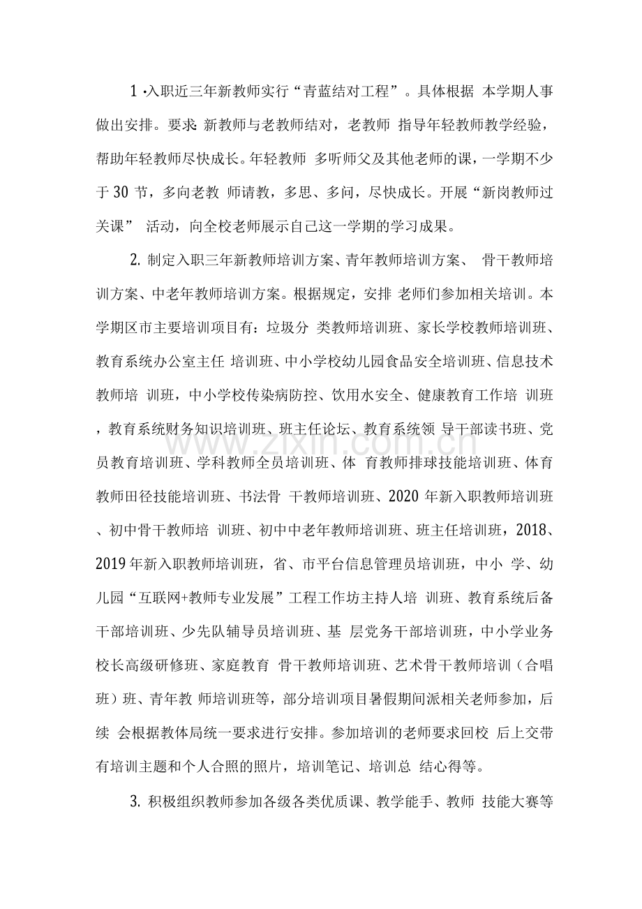 2. 制定入职三年新教师培训方案、青年教师培训方案、 骨干教师培训方案、中老年教师培训方案。根据规定,安排 老师们参加相关培训。本学期区市主要培训项目有:垃圾分 类教师培训班、家长学校教师培训班、教育系统办公室主任 培训班、中小学校幼儿园食品安全培训班、信息技术教师培 训班,中小学校传染病防控、饮用水安全、健康教育工作培 训班,教育系统财务知识培训班、班主任论坛、教育系统领 导干部读书班、党员教育培训班、学科教师全员培训班、体 育教师排球技能培训班、体育教师田径技能培训班、书法骨 干教师培训班、2020年新入职教师培训班、初中骨干教师培 训班、初中中老年教师培训班、班主任培训班,2018、2019 年新入职教师培训班,省、市平台信息管理员培训班,中小 学、幼儿园“互联网+教师专业发展”工程工作坊主持人培 训班、教育系统后备干部培训班、少先队辅导员培训班、基 层党务干部培训班,中小学业务校长高级研修班、家庭教育 骨干教师培训班、艺术骨干教师培训(合唱班)班、青年教 师培训班等,部分培训项目暑假期间派相关老师参加,后续 会根据教体局统一要求进行安排。参加培训的老师要求回校 后上交带有培训主题和个人合照的照片,培训笔记、培训总 结心得等。