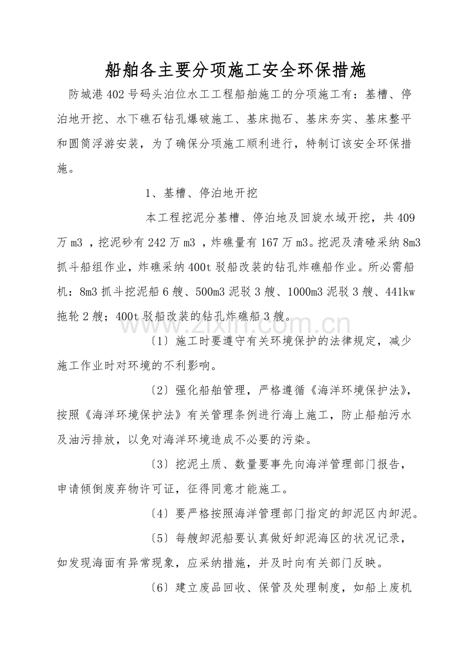 防城港402号码头泊位水工工程船舶施工的分项施工有:基槽、停泊地开挖、水下礁石钻孔爆破施工、基床抛石、基床夯实、基床整平和圆筒浮游安装,为了确保分项施工顺利进行,特制订该安全环保措施。