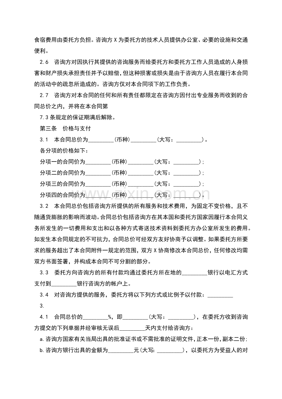 3.3 委托方向咨询方的所有付款均通过委托方所在地的_________银行以电汇方式支付到_________银行咨询方的帐户上。