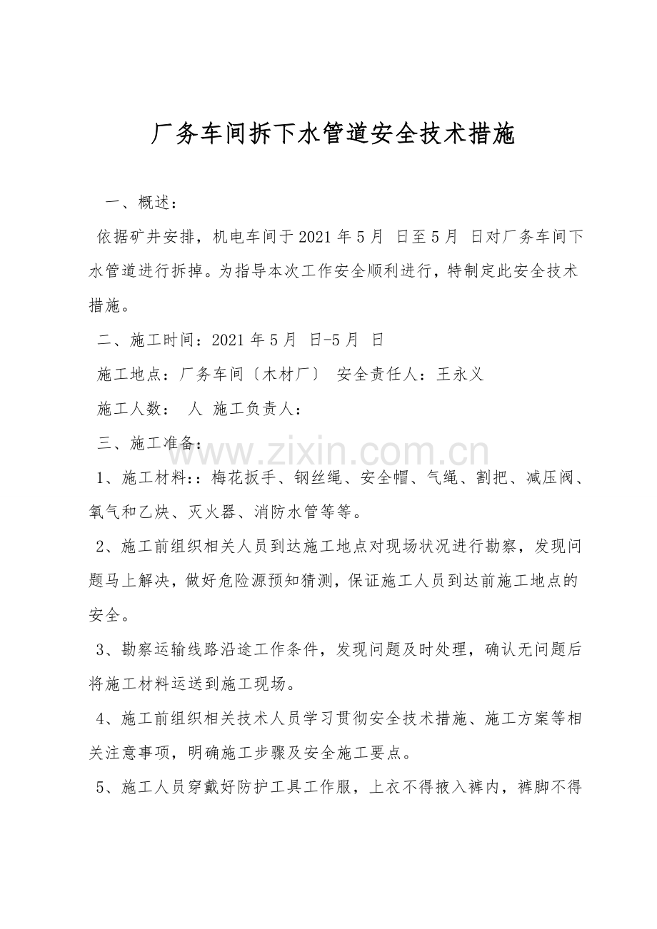 依据矿井安排,机电车间于2021年5月 日至5月 日对厂务车间下水管道进行拆掉。为指导本次工作安全顺利进行,特制定此安全技术措施。