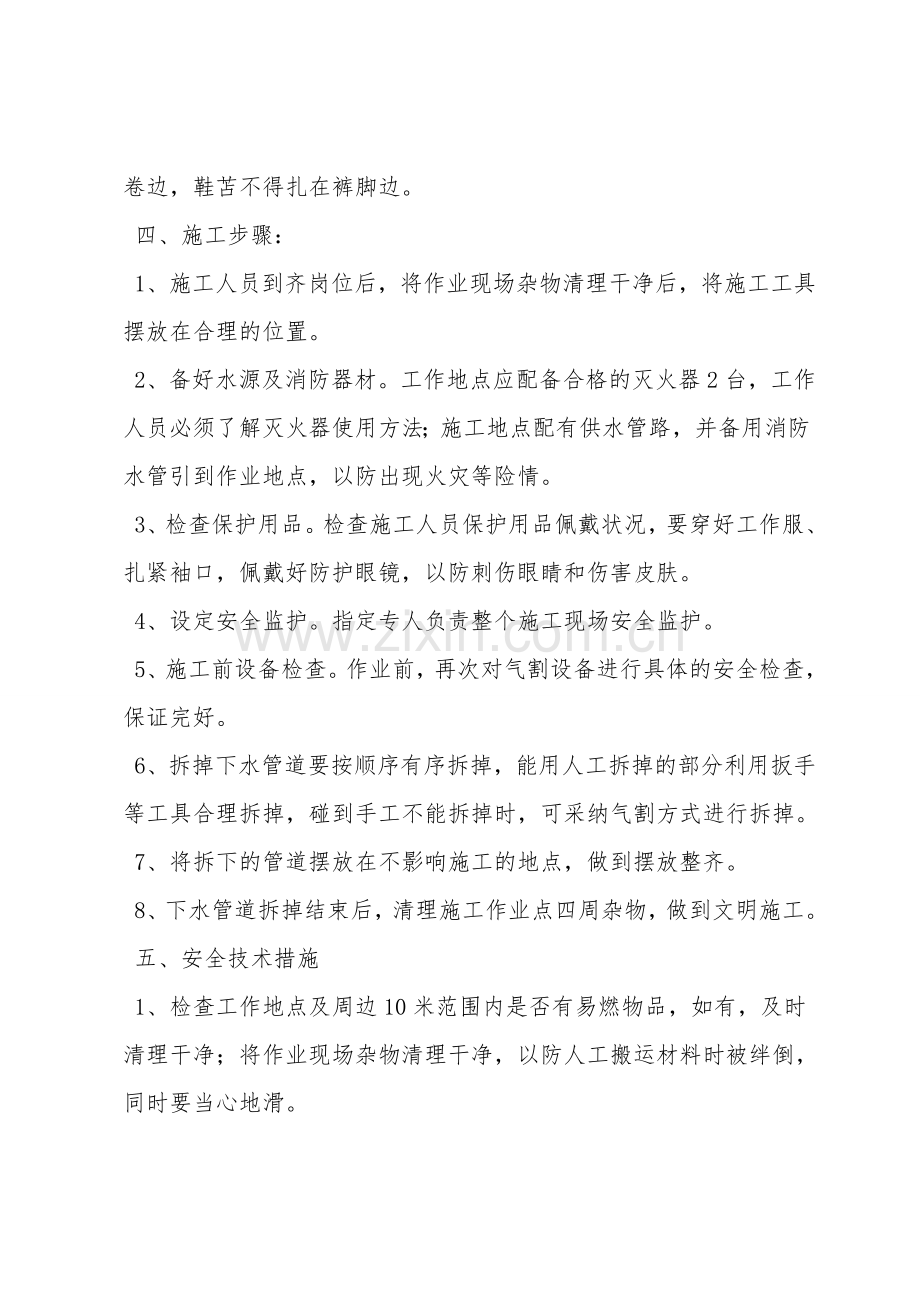 6、拆掉下水管道要按顺序有序拆掉,能用人工拆掉的部分利用扳手等工具合理拆掉,碰到手工不能拆掉时,可采纳气割方式进行拆掉。