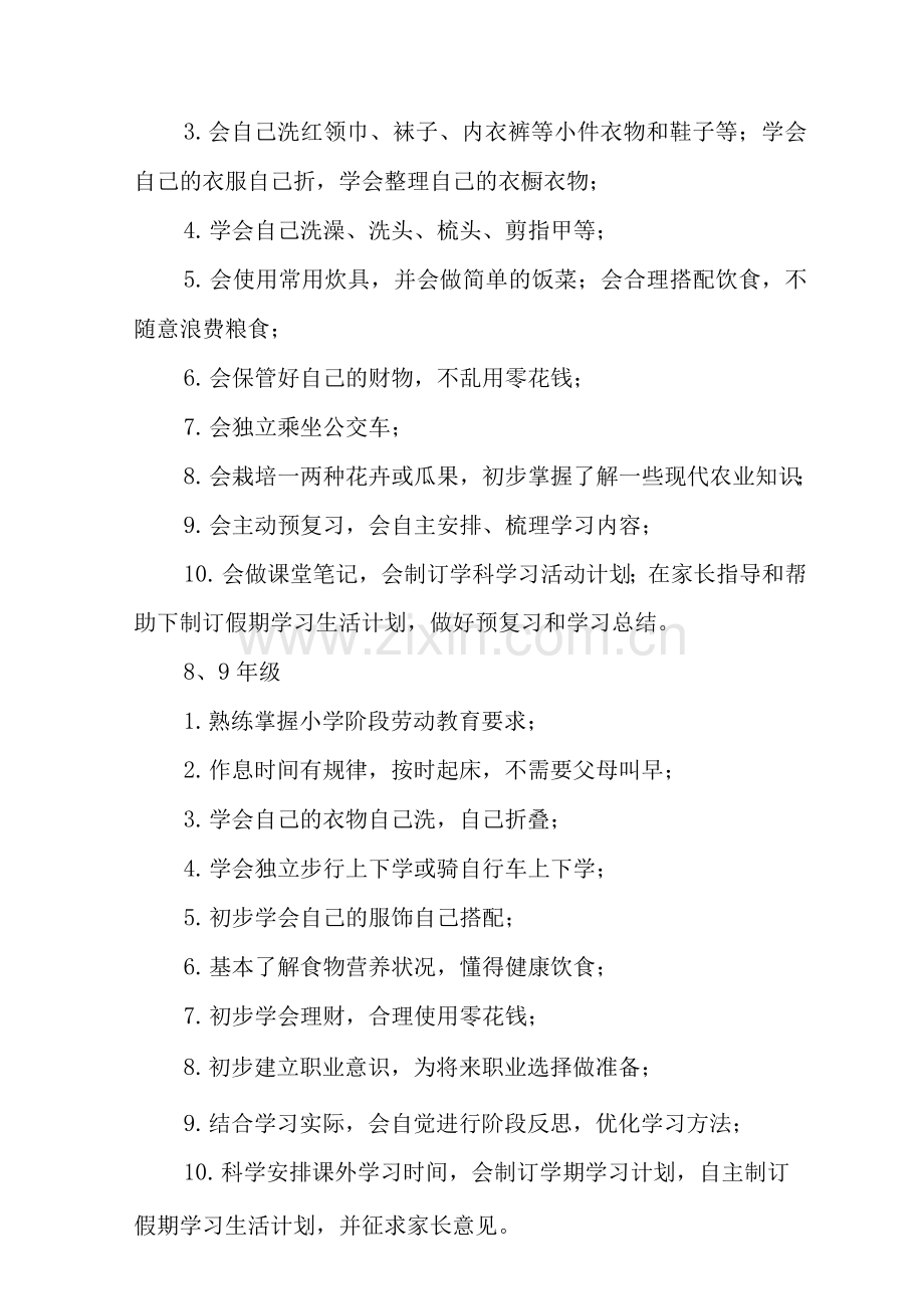 2.8、9年级:注重掌握日常生活中的基本劳动知识和劳动技能,加强家政学习,开展社区服务,适当参加生产劳动,承担校园和社区的部分劳动任务,培养服务集体、服务社区责任意识,初步养成认真负责、吃苦耐劳的品质和职业意识。
