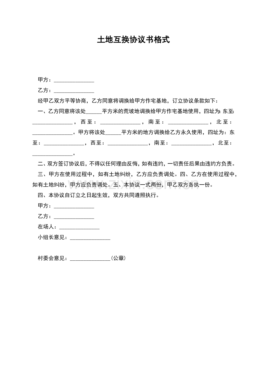 一、乙方同意将该处______平方米的荒坡地调换给甲方作宅基地使用,四址为:东至:_______________,西至:_______________,南至:_______________,北至:_______________。甲方将该处______平方米的地方调换给乙方永久使用,四址为:东至:_______________,西至:_______________,南至:_______________,北至:_______________。