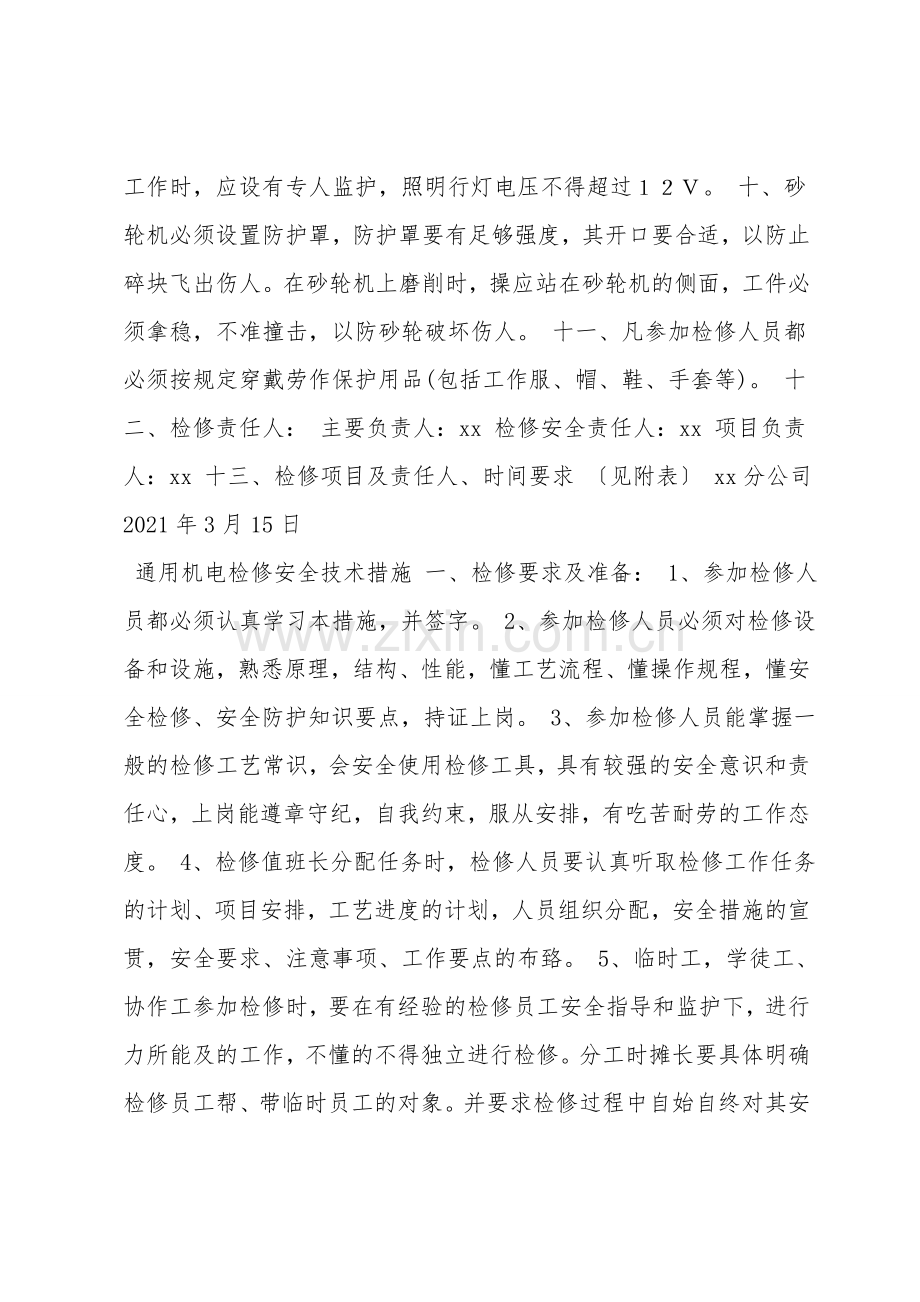 通用机电检修安全技术措施 一、检修要求及准备: 1、参加检修人员都必须认真学习本措施,并签字。 2、参加检修人员必须对检修设备和设施,熟悉原理,结构、性能,懂工艺流程、懂操作规程,懂安全检修、安全防护知识要点,持证上岗。 3、参加检修人员能掌握一般的检修工艺常识,会安全使用检修工具,具有较强的安全意识和责任心,上岗能遵章守纪,自我约束,服从安排,有吃苦耐劳的工作态度。 4、检修值班长分配任务时,检修人员要认真听取检修工作任务的计划、项目安排,工艺进度的计划,人员组织分配,安全措施的宣贯,安全要求、注意事项、工作要点的布臵。 5、临时工,学徒工、协作工参加检修时,要在有经验的检修员工安全指导和监护下,进行力所能及的工作,不懂的不得独立进行检修。分工时摊长要具体明确检修员工帮、带临时员工的对象。并要求检修过程中自始自终对其安全监护及安全操作负责。 6、现场检修必须明确检修负责人,安全负责人,技术负责人,停送电负责人。 7、检修过程中严密实施自保、互保、联保。凡两人以上检修的项目,必须设一人负责安全。由安全负责人负责安全监护。多人检修时,应由安全负责人负责全过程的安全监护。 8、参加人员班前不得喝酒,不准在工地上打闹。班前喝酒,精神状态不佳,精力不集中,过度劳累,值班长一定要对其劝阻参加。