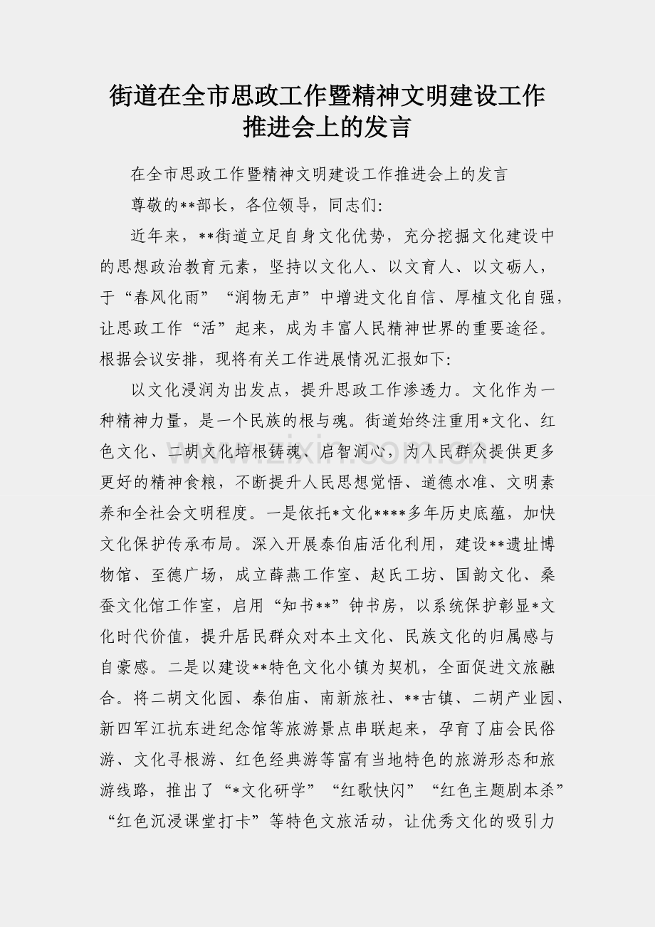 街道在全市思政工作暨精神文明建设工作推进会上的发言