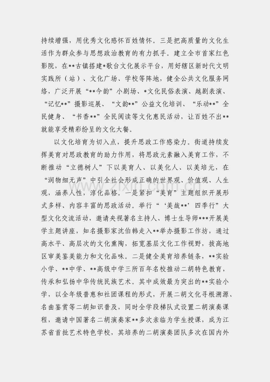 以文化培育为切入点,提升思政工作感染力。街道持续发挥美育对思政教育的助力作用,将思政元素融入美育工作,不断推动“立德树人”下以美育人、以美化人、以美培元,在“润物细无声”中引全社会形成正确的世界观、价值观、人生观,涵养人性,淳化品格。一是紧扣“美育”主题组织开展形式多样、内容丰富的思政活动。举行“‘美哉**’四季行”大型文化交流活动,邀请央视著名主持人、博士生导师***开展美学主题讲座,知名摄影家沈伯韩走入**举办摄影工作坊,通过高水平、高层次的文化熏陶,拓宽基层文化工作视野,拔高地区审美鉴美能力和文化品味。二是健全美育培养链条,**实验小学、**中学、**高级中学三所百年名校推动二胡特色教育,传承和弘扬中华传统民族艺术。其中成效最为突出的**实验小学,以全年级普惠和社团课程的形式,开展二胡文化寻根溯源、名曲鉴赏等二胡知识普及,同时全学段梯队式设置二胡演奏课程,邀请中国著名二胡演奏家**多次亲临为学生授课,成为江苏省首批艺术特色学校,其培养的二胡演奏团队多次在国内外比赛中获得大奖。三是充分发挥“最美”先进典型在思政工作中的示范引导作用。***、***、***家庭评为“全国最美”“全省最美”“全市最美”家庭,以优良家风引领文明风尚;二胡制作师**、**、**入选第五批市级非物质文化遗产代表性传承人,以非遗传承弘扬传统文化;**、**入选**好人,以“好人”精神彰显道德力量。