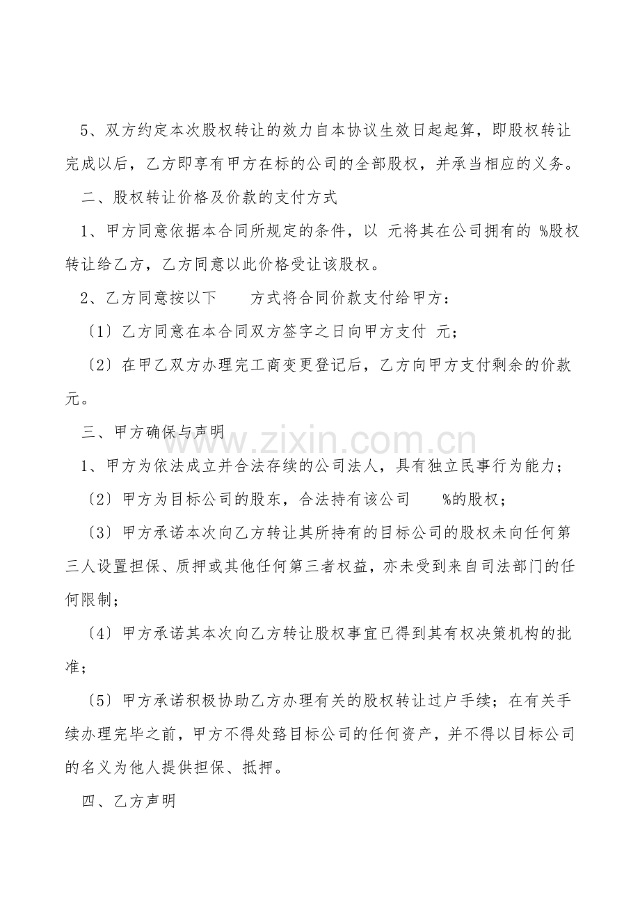 1、甲方同意依据本合同所规定的条件,以 元将其在公司拥有的 %股权转让给乙方,乙方同意以此价格受让该股权。