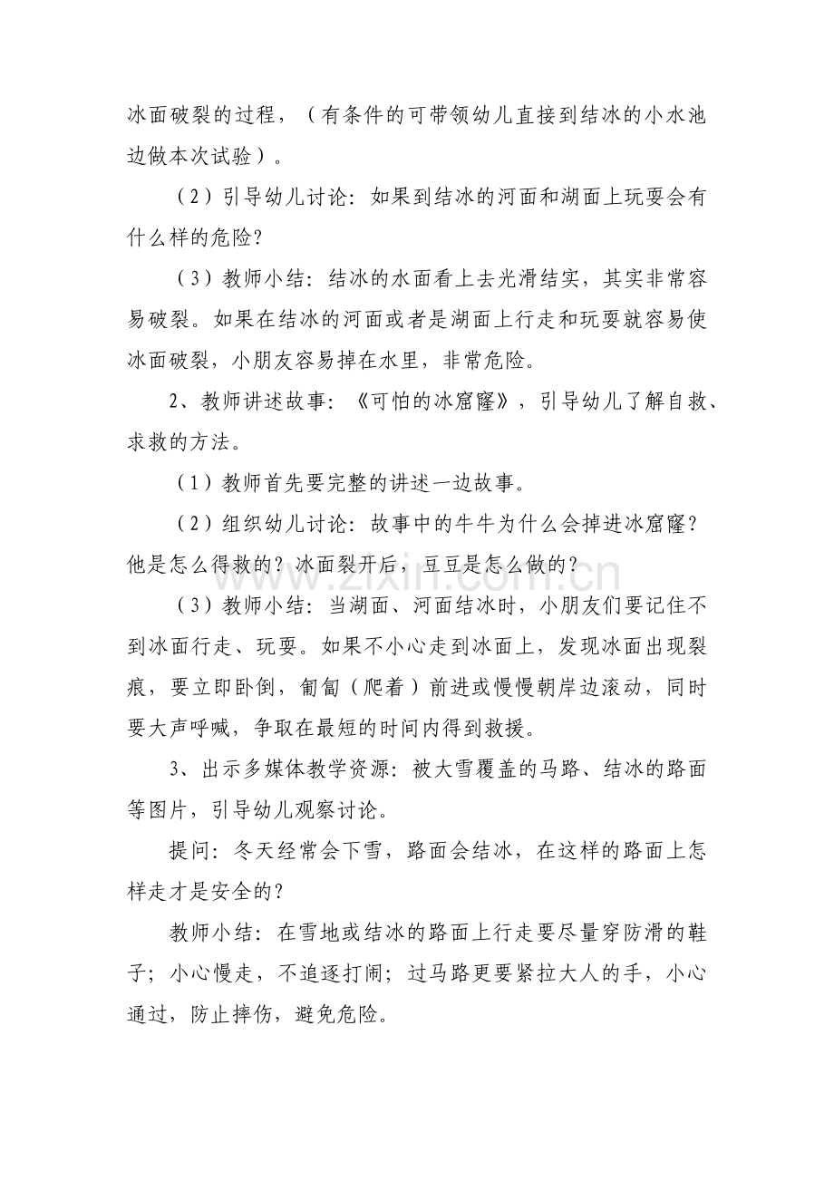 (3)教师小结:当湖面、河面结冰时,小朋友们要记住不到冰面行走、玩耍。如果不小心走到冰面上,发现冰面出现裂痕,要立即卧倒,匍匐(爬着)前进或慢慢朝岸边滚动,同时要大声呼喊,争取在最短的时间内得到救援。