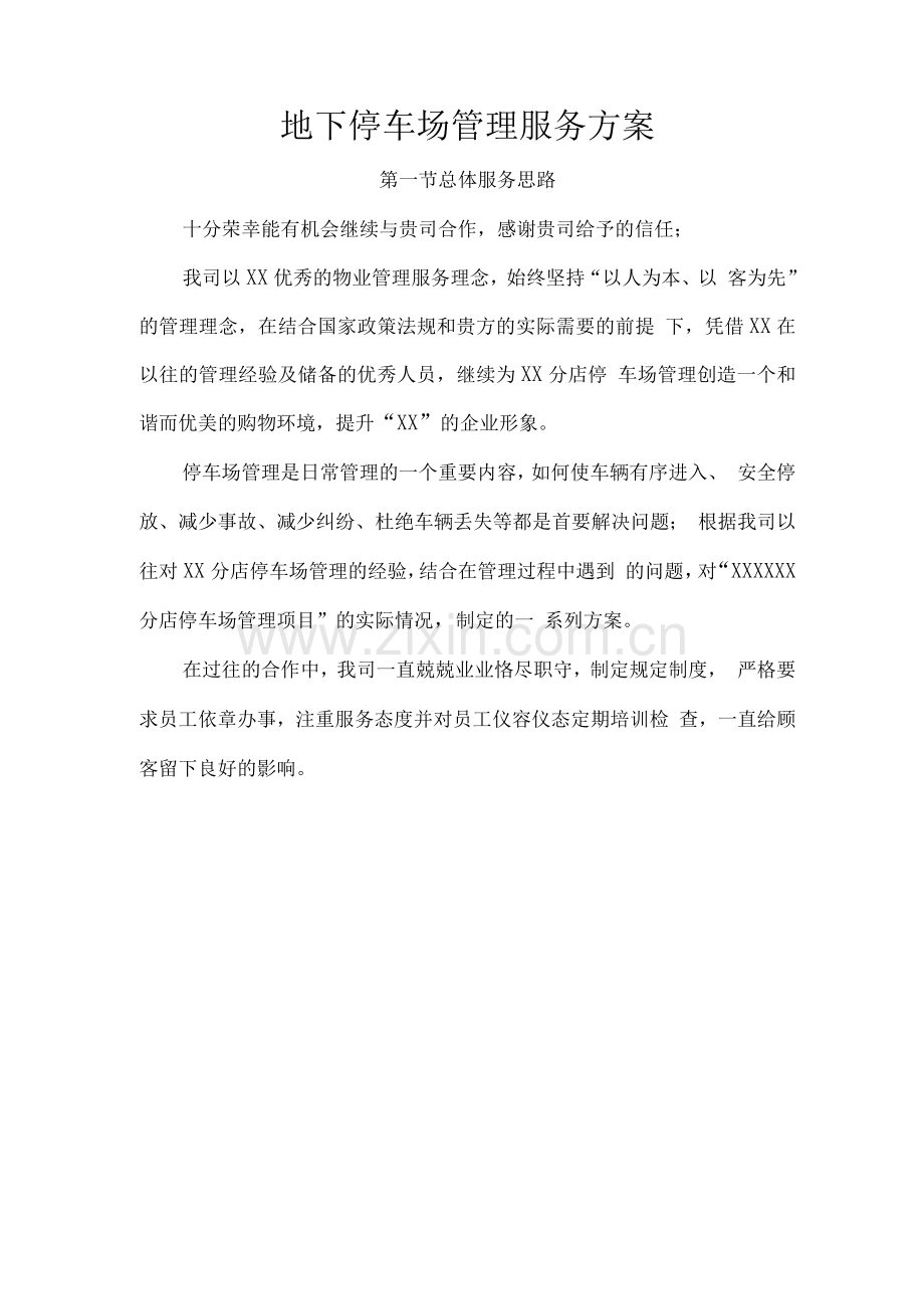 我司以XX优秀的物业管理服务理念,始终坚持“以人为本、以 客为先”的管理理念,在结合国家政策法规和贵方的实际需要的前提 下,凭借XX在以往的管理经验及储备的优秀人员,继续为XX分店停 车场管理创造一个和谐而优美的购物环境,提升“XX”的企业形象。