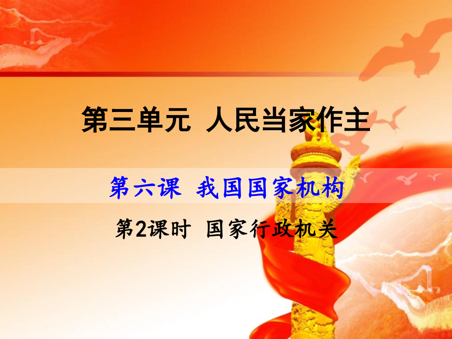 ,第六课 我国国家机构,第三单元 人民当家作主,第,2,课时 国家行政机关,你了解下面的一些国家机构吗?,新课导入,国家体育总局,国家统计局,国家旅游局,上海知识产权局,民政部,财政部,新课讲解,运用你的经验,图中穿制服人员分别是哪些政府部门的工作人员?,图,1,图,2,图,3,公安部门,财政部门,工商部门,一、国家权力机关的执行机关,(,1,)含义:,行政机关是,依据宪法,设立的,依法行使国家,行政职权,,组织和管理国家行政事务的,国家机关,。,(,2,)组成:,我国行政机关由,国务院,及其领导的,地方各级人民政府组成,。,1.,行政机关的含义及组成。,探究与分享,P80,:,2015,年,2,月以来,某市十六届人大常委会先后通过,11,个关于经济社会发展的决议、决定。市政府高度重视多次召开会议,对每一份决议、决定贯彻落实并向人大常委会报告。,从上述内容看,市政府与市人大之间是什么关系?,(,1,)国家行政机关是,国家权力,机关的,执行机关,,负责贯彻执行国家权力机关通过的有关,法律、决议和决定,。,(,2,),各级人民政府,对本级人民代表大会,负责并报告工作,;县级以上地方各级人民政府在本级人民代表大会闭会期间,对本级,人大常委会负责并报告工作,。,2.,行政机关与权力机关的关系是怎样的?,探究与分享,P82,:近年来,我国政府不断健全医疗保障制度。,2003,年起试点的新型农村合作医疗制度,在,2010,年基本覆盖全国农村居民;,2012,年提出建立城乡居民大病保险制度,到,2017,年建立起比较完善的大病保险制度,结合上述材料,说一说行政机关是如何履行为人民服务职责的。,通过不断健全相关制度(健全医疗保障制度),维护人民的合法权益,提高人民的健康水平。,通过加强基础实施建设(建立三甲医院),为人民享有的权利提供物质保障。,通过依法行使职权,为人民谋利益。,将为人民服务真正落实到行动中。等等。,人民是国家的主人,行政机关的,权力,来自,人民,的授予。,行政机关必须全心全意为人民服务,以实现社会公共利益的最大化。,3.,行政机关的,职责,是什么?,二、行政机关的职权,探究与分享,P83,:行政机关负有维护良好公共秩序的职责;,行政机关应当为老百姓提供优质服务;,行政机关负有市场监管职责,你还知道哪些行政机关?它们有哪些职权?请举例说明。,我国的,财政部门,,通过拟订财税发展战略、规划、政策和改革方案并组织实施,分析预测宏观经济形势,参与制定各项宏观经济政策,提出运用财税政策实施宏观调控和综合平衡社会财力的建议,拟订中央与地方、国家与企业的分配政策,完善鼓励公益事业发展的财税政策;,我国的,教育部门,,通过研究提出教育改革与发展战略和全国教育事业发展规划,拟定教育体制改革的政策以及教育发展的重点、结构、速度,指导并协调实施工作。,根据宪法,我国县级以上人民政府主要管理,经济、教育、科学、文化、卫生、体育事业、城乡建设事业和财政、民政、公安、民族事务、司法行政、监察、计划生育等,行政工作。,国务院,,即,中央人民政府,,是我国,最高行政机关,,统一领导地方各级人民政府。,1.,行政机关有哪些职权,?,探究与分享,P83,:,2016,年,国务院出台,“十三五”脱贫攻坚计划,,对自然条件严酷地区的农村建档立卡贫困人口实施易地搬迁扶贫。小成老家的县政府按照规划要求,在太行山脚下修建了房屋,把全村乡亲都搬到新居。,从材料中可以看出,国务院和县政府的职权有何不同?,【,提示,】,国务院即中央人民政府,是最高国家权力机关的执行机关,是最高国家行政机关。县政府应当接受和服从国务院的统一领导,要执行国务院作出的决定。,探究与分享,实践中,行政机关应当如何行使职权?同学们对此展开热烈的讨论。,P84,同学甲,行政机关到底有哪些职权,要看宪法和法律是怎么规定的,宪法和法律没有规定的权力,行政机关不能行使。,同学乙,即使法律对行政机关行使职权的程序作出了明确规定,行政机关只要做到实体上合法,就不构成违法行为,同学丙,【,提示,】,以上同学的说法是对的。,行政机关必须依法行政。,行政机关享有哪些职权,具体如何行使职权,都必须严格遵照宪法和法律。行政机关要坚持法定职责必须为、法无授权不可为,勇于负责、敢于担当,坚决纠正不作为、乱作为,坚决克服懒政、怠政。,(,1,)行政机关要坚持,法定职责必须为,、,法无授权不可为,,勇于负责、敢于担当,坚决纠正不作为、乱作为,坚决克服懒政、怠政。,(,2,)为了防止工作人员出现履职不力、监管缺失、失职渎职、徇私枉法等问题,,必须加强对行政权的监督和制约,切实做到有权必有责,用权受监督,权责要对等,失责要追究,侵权要赔偿,。,2.,行政机关如何行使职权,?,探究与分享,宪法作出上述规定是为了防止工作人员出现履职不力、监管缺失、失职渎职、徇私枉法等问题。,宪法为何要作出上述规定?请谈谈你的看法。,拓展空间,法治,是治国理政的,基本方式,。,法治政府,是现代政府的,基本特征,。我国自改革开放以来,不断推进法治政府建设。,课堂小结,1.,关于全国人民代表大会与国务院的关系,下列说法正确的是(),A,国务院是人民行使当家作主权力的机关,B,国务院和全国人民代表大会相互监督,C,全国人民代表大会由国务院产生并对其负责,D,全国人民代表大会通过的决议国务院必须贯彻执行,随堂演练,2.,2017,年,5,月,9,日,浙江省住房