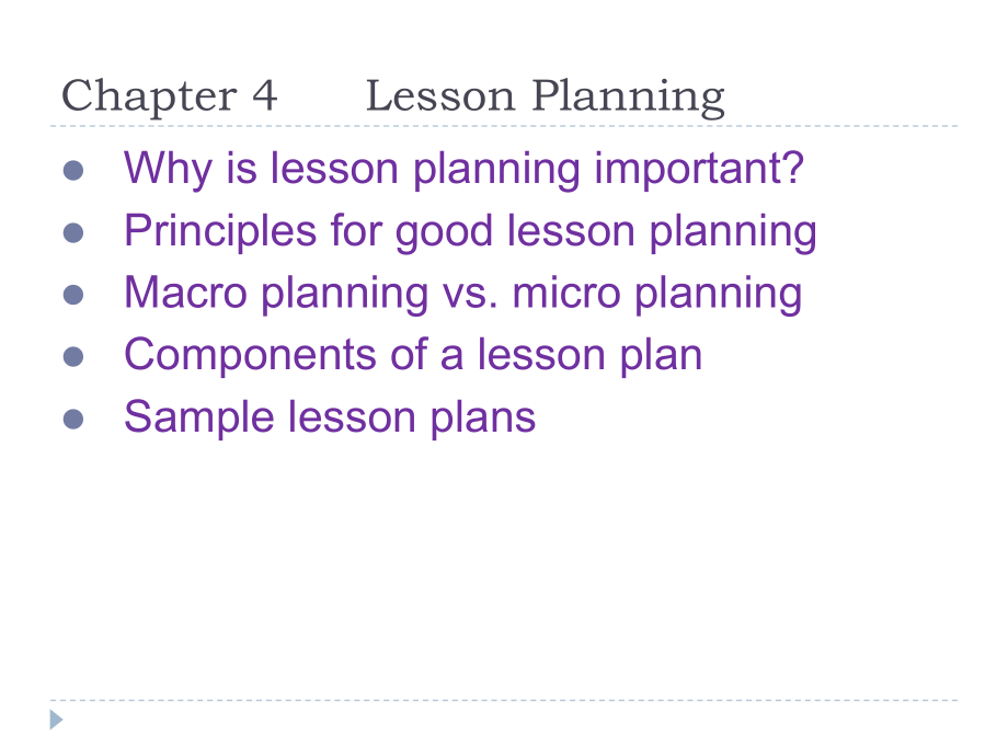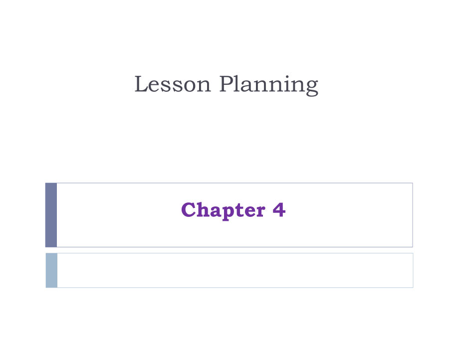 单击此处编辑母版标题样式,单击此处编辑母版文本样式,第二级,第三级,第四级,第五级,#,Chapter 4,Lesson Planning,Chapter 4 Lesson Planning,Why is lesson planning important?,Principles for good lesson planning,Macro planning vs.micro planning,Components of a lesson plan,Sample lesson plans,4.1 Importance of Lesson Planning,Q:What is a lesson plan?What is planned for the lesson?,“,A lesson plan is a,framework,of a lesson in which teachers make,advance,decisions,about,what,they hope to achieve and,how,they would like to achieve it.,”,What,to achieve:,aims,objectives,How,to achieve:,materials,activities,techniques,resources,etc.,True or False,()Experienced teachers do not need to do lesson planning.,()A lesson plan can be used for different classes in the same grade.,()A lesson plan of the same textbook can be used year after year.,()A lesson plan is used flexibly in the classroom teaching.,Flexibility of a lesson plan,“,no teaching learning situation is really static.Social and educational circumstances change,views of methodology change,and resources available change,(McDonough and Shaw,2003).,”,Benefit from lesson planning,Makes teachers,aware of the aims,and,language contents,of the lesson,so as to plan the activities and choose the techniques accordingly;,Helps teachers,distinguish the various stages,of a lesson and see the relationship between them so that the activities of different levels can,be arranged properly,and the lesson can,move smoothly,from one stage to another;,3.Gives teachers the opportunity to,anticipate potential problems,so that they can be prepared;,4.Gives teachers,esp.novice ones,confidence,in class;,5.Raises teachers,awareness of the teaching aids,needed;,6.Planning is a good practice and a sign of,professionalism,.,4.2 Principles for Good Lesson Planning,Aim,Variety,Flexibility,Learnability,Linkage,4.2 Principles for Good Lesson Planning,Aim,:the realistic goals for the lesson;what students are able to do by the end of the lesson;,Variety,:different types of activities;a wide selection of materials;,Flexibility,:preparing some extra and alternative tasks and activities,Learnability,:the contents and tasks planned should be within the learning capability of the studentsDoing things that are beyond or below the students,coping ability will diminish their motivation(Schumann,1999),Linkage,:the stages and the steps within each stage are linked with one another.,4.3 Macro Planning vs.Micro Planning,Macro planning:,planning over a longer period of time,Micro planning:,planning for a specific unit or a lesson,Study Figure 4.3Macro planning vs.Micro planning,Lesson,planning,Program planning,Macro planning,Micro planning,One semester planning,Half a semester planning,Unit planning,4.3.1 Macro planning(how),Knowing about the profession,Professional competence,Knowing about the institution,Time,length,frequency of lessons,physical conditions of classrooms,exam requirements,Knowing about the learners,Age range,sex proportion,social background,motivation,attitudes,interests,learning needs,etc.,Knowing about the curriculum/syllabus,Principles,purposes,requirements,targets specified,methodological suggestions,assessment requirement,etc.,Knowing about the textbook,Philosophy of teaching,organization of learning contents,major topics,ways of assessment,etc.,Knowing about the objectives,What the learners are expected to achieve and able to do,4.3.2 Micro planning,Macro planning provides a general guidance for language teachers.,Micro planning is often an individual activity and different teachers may have different ways of writing their own lesson plans.,4.4 Components of a Lesson Plan,Different teachers have different styles and may use different teaching procedures.,“,Every Lesson is Unique,”,TASK,Work in groups of four and discuss what should be included in a good lesson plan.,1.Teaching objectives,2.,3.,4.,5.,4.4 Components of a Lesson Plan,Background information,Teaching aims,Language contents and skills,Stages and procedures,Teaching aids,Assignments,Teacher,s after-lesson reflection,TASK 2,Work in pairs and compare the two sets of statements,and decide which set is more suitable for the aims of the lesson and which is not.Why?,1,To learn the use of comparative,Able to use a number of comparative adj.to compare things,or people,2,To learn the structure,BE GOING TO by heart,Able to talk,about what their future plans are.,3,To listen to a dialogue,About to understand,a conversation about shopping,4,To learn,to write a letter,Can write a personal letter,about ones school life,5,To read an article about safety,Able,to understand the main idea of an article about safety and can write a list of safety rules for the school,6,To learn the new vocabulary of sports by,heart,Able,to name different sports in English using pics as cues and able to tell each other what sports they like,7,To,learn to express their own option about military training,Can talk about their opinions or feelings,about military training to each other,8,To do,a role play,Can role play the dialogue of going,shopping,4.4.1 Background information,Who are my students?,How many students are there in class?,What ages?,Which grade are they in?,What are they like?,When and where is my lesson?,How long does each lesson last?,4.4.2 Teaching aims,Points for attention,Plan the lesson from the point of view of the students,what students are able to achieve(learners,performance);,Design the teaching stages and classroom activities for the purpose of fulfilling the aims;,Consider the change of the overall objects described in the NEC-from purely linguistic to an emphasis on language skills,knowledge,affects,strategies and culture awareness,Activity,:Task 4suppose you are going to teach the following lesson to a group of first year junior level students.Write a few objectives for the lesson.,4.4.3 Language contents and skills,Language contents:structures(grammar),vocabulary,functions,topic