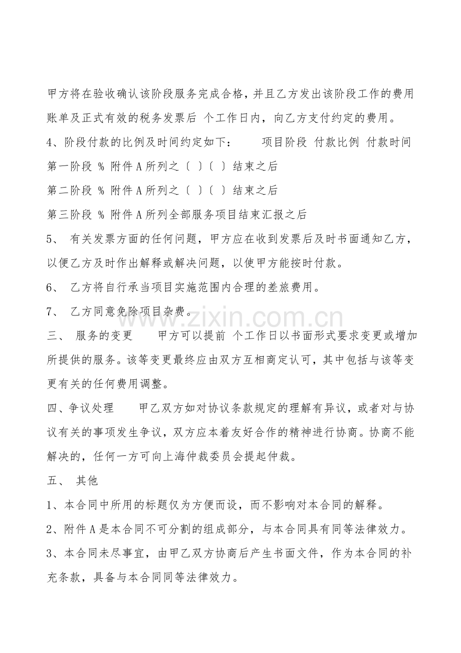 3、甲乙双方一致同意项目服务费按阶段以人民币形式支付。每阶段末,甲方将在验收确认该阶段服务完成合格,并且乙方发出该阶段工作的费用账单及正式有效的税务发票后 个工作日内,向乙方支付约定的费用。