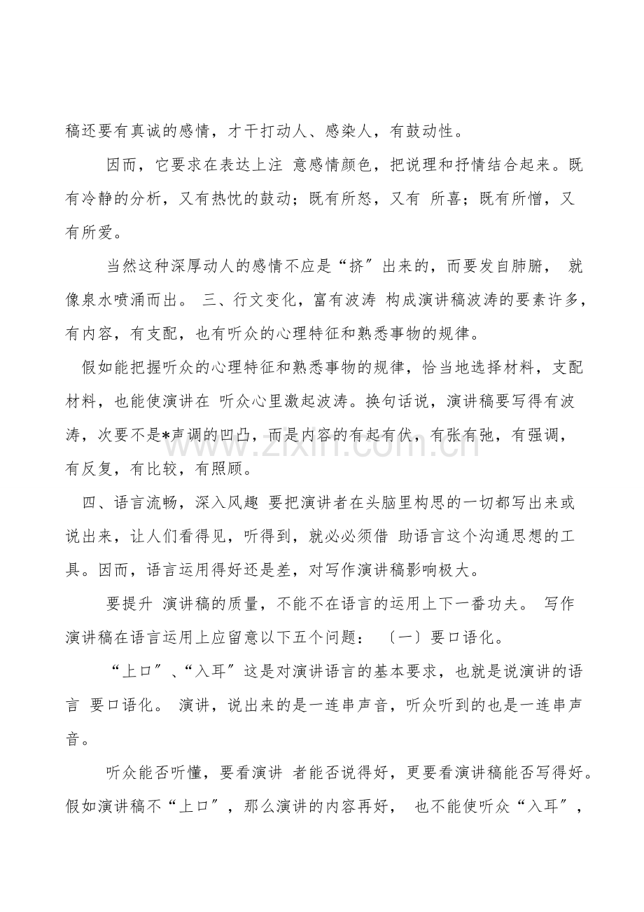 要提升 演讲稿的质量,不能不在语言的运用上下一番功夫。 写作演讲稿在语言运用上应留意以下五个问题: 〔一〕要口语化。