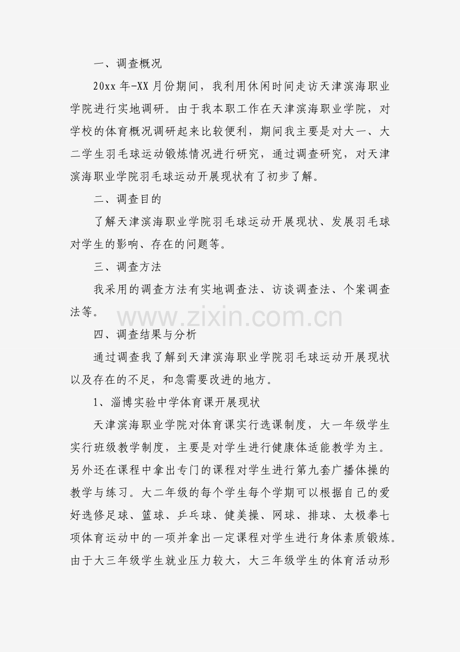 20xx年-XX月份期间,我利用休闲时间走访天津滨海职业学院进行实地调研。由于我本职工作在天津滨海职业学院,对学校的体育概况调研起来比较便利,期间我主要是对大一、大二学生羽毛球运动锻炼情况进行研究,通过调查研究,对天津滨海职业学院羽毛球运动开展现状有了初步了解。