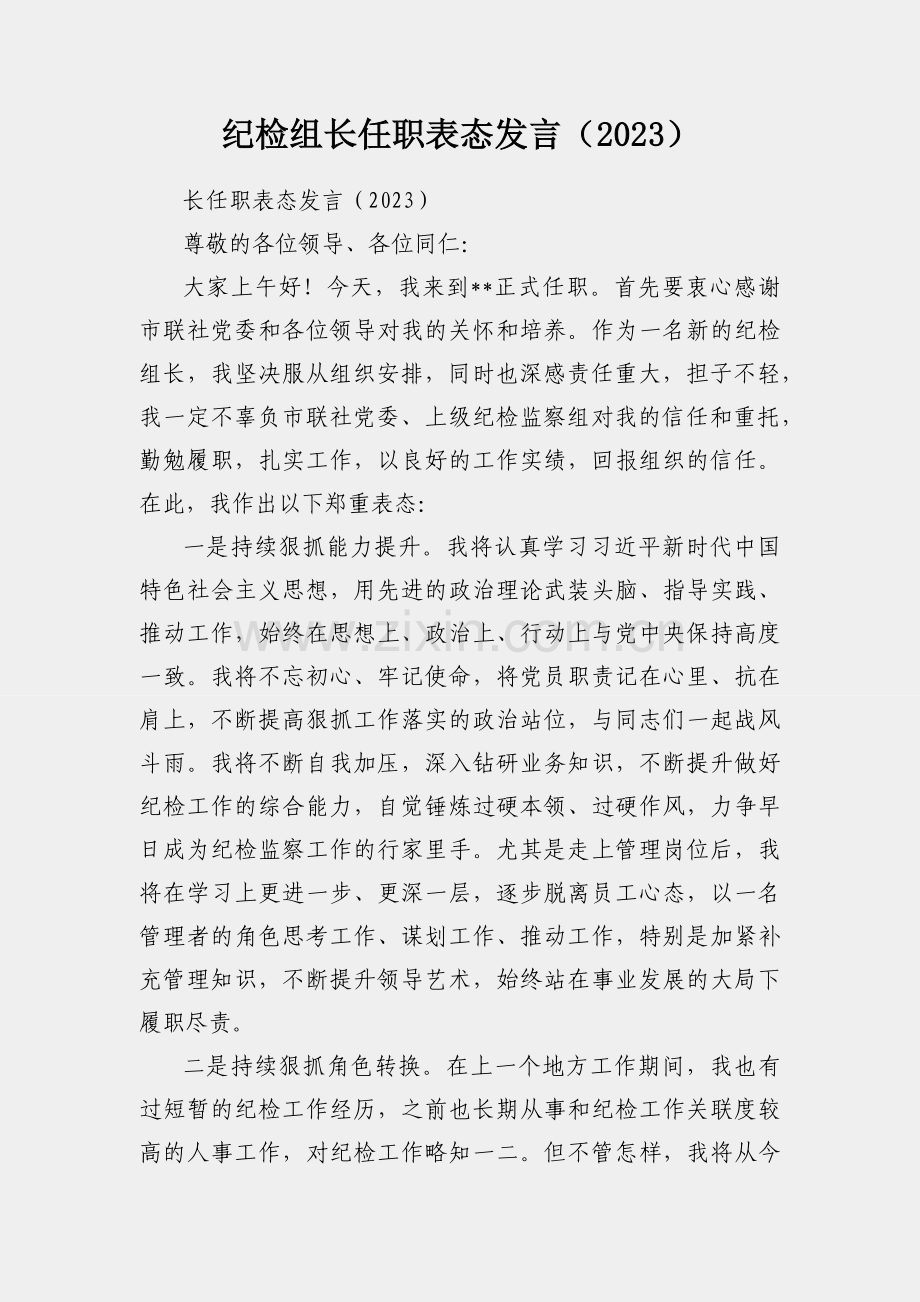 大家上午好!今天,我来到**正式任职。首先要衷心感谢市联社党委和各位领导对我的关怀和培养。作为一名新的纪检组长,我坚决服从组织安排,同时也深感责任重大,担子不轻,我一定不辜负市联社党委、上级纪检监察组对我的信任和重托,勤勉履职,扎实工作,以良好的工作实绩,回报组织的信任。在此,我作出以下郑重表态: