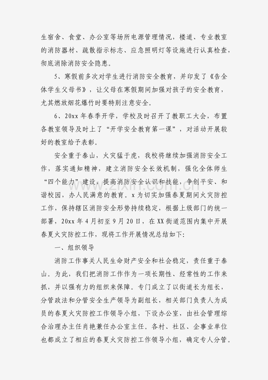 安全重于泰山,火灾猛于虎,我校将继续加强消防安全工作,落实通知精神,建立消防安全长效机制,强化全体师生“四个能力”建设,提高消防安全认识和技能,争创平安、和谐校园,办人民满意的教育。x为切实加强春夏期间火灾防控工作,保持辖区消防安全形势持续稳定,根据上级部门的统一部署,20xx年4月初至9月20日,在XX街道范围内集中开展春夏火灾防控工作,现将工作开展情况总结如下: