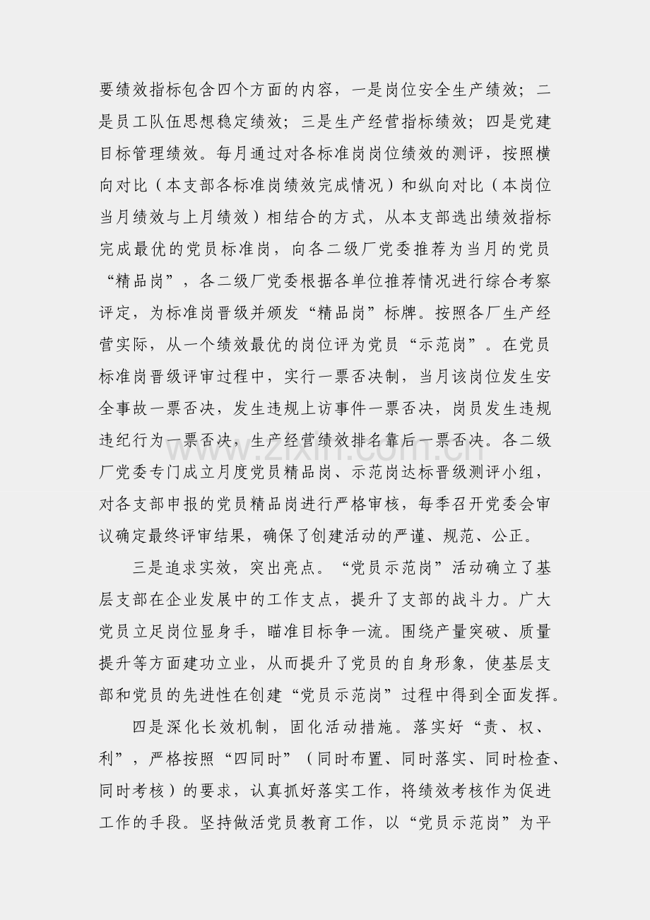 近几年来,**集团党委积极开展“党员示范岗”创建活动,破解了一道道生产经营难题,坚持把党员的权利、义务和岗位目标、岗位业绩、岗位职责和岗位作用结合起来,激发广大党员在加快公司发展的实践中创先进、争优秀、当先锋,引领广大干部职工立足岗位做贡献,创新工作促发展,有效推进了安全生产长足进步,推动了公司高质量发展。