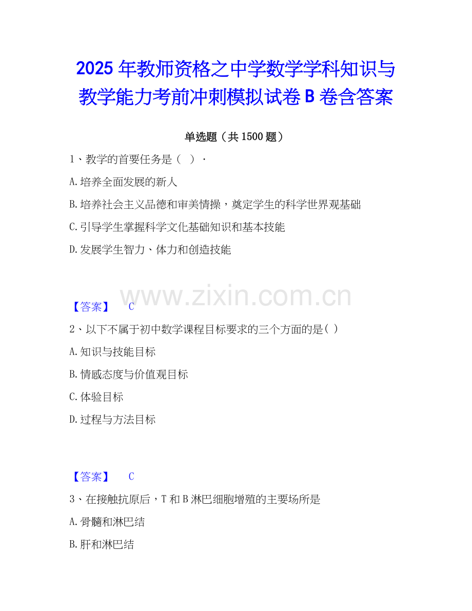 2025年教师资格之中学数学学科知识与教学能力考前冲刺模拟试卷B卷含答案