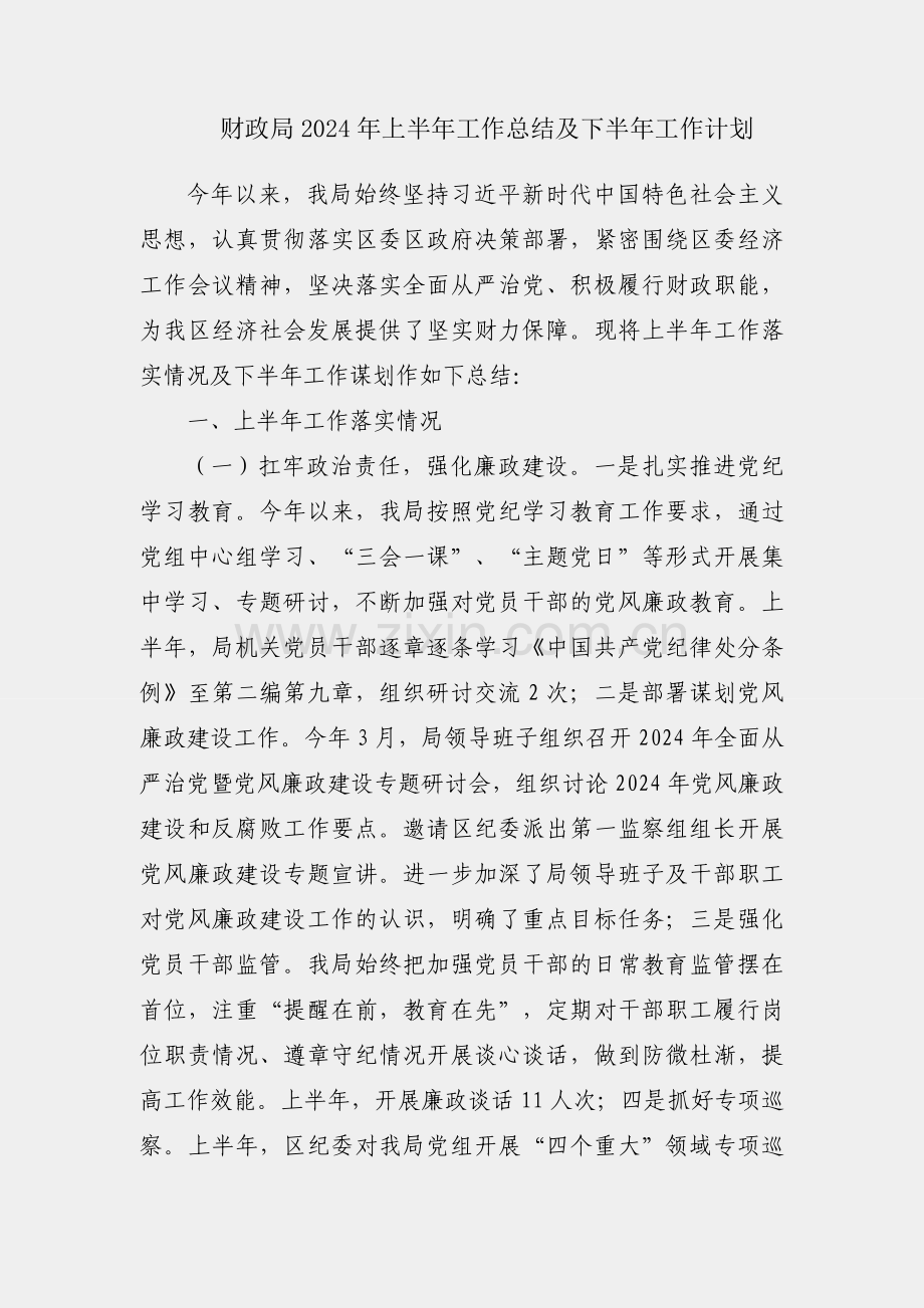 财政局2024年上半年工作总结及下半年工作计划