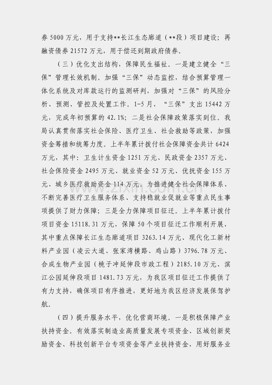 (三)优化支出结构,保障民生福祉。一是建立健全“三保”管理长效机制。加强“三保”动态监控,结合预算管理一体化系统及对库款运行的监测研判,加强对“三保”的风险分析、预测、管控及处置工作。1-5月,“三保”支出15442万元,完成年初预算的42.1%;二是社会保障政策落实到位。我局认真贯彻落实社会保险、医疗卫生、社会救助等政策,加强资金筹措和统筹力度。上半年累计拨付社会保障资金共计6424万元,其中:卫生计生资金1251万元、民政资金2357万元、社会保险资金2495万元、就业资金52万元、优抚资金155万元、城乡医疗救助资金114万元。为推进健全社会保障体系、不断完善医疗卫生服务体系、支持稳就业促就业等重点民生事项提供了财力保障;三是全力保障项目征迁。上半年累计拨付项目资金15118.31万元,保障50个项目征迁工作顺利开展,其中重点保障长江生态廊道项目3263.14万元、现代化工新材料产业园(凌云大道、张家湾横路、鸡山路)3796.78万元、合成生物产业园(桃子冲延伸段市政工程)2185.10万元、滨江公园延伸段项目1481.73万元,为我区项目征迁工作提供了有力支持,确保项目有序推进,更好地为我区经济发展保驾护航。